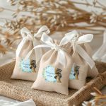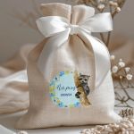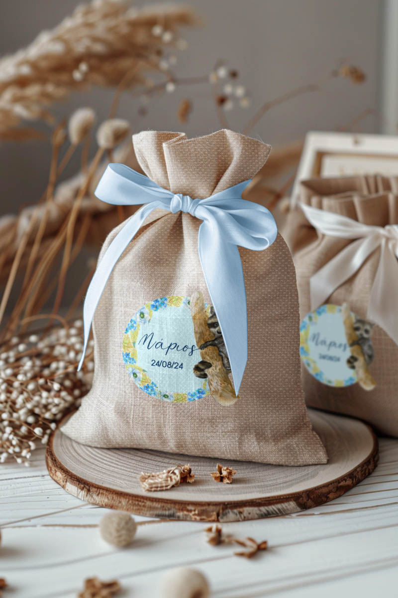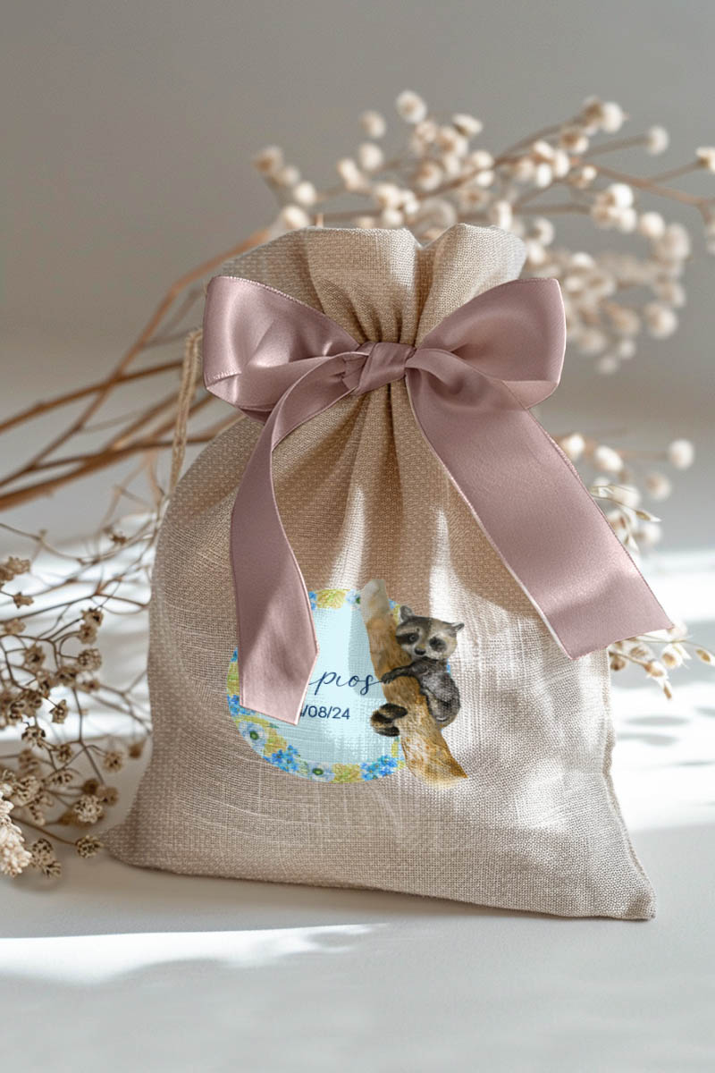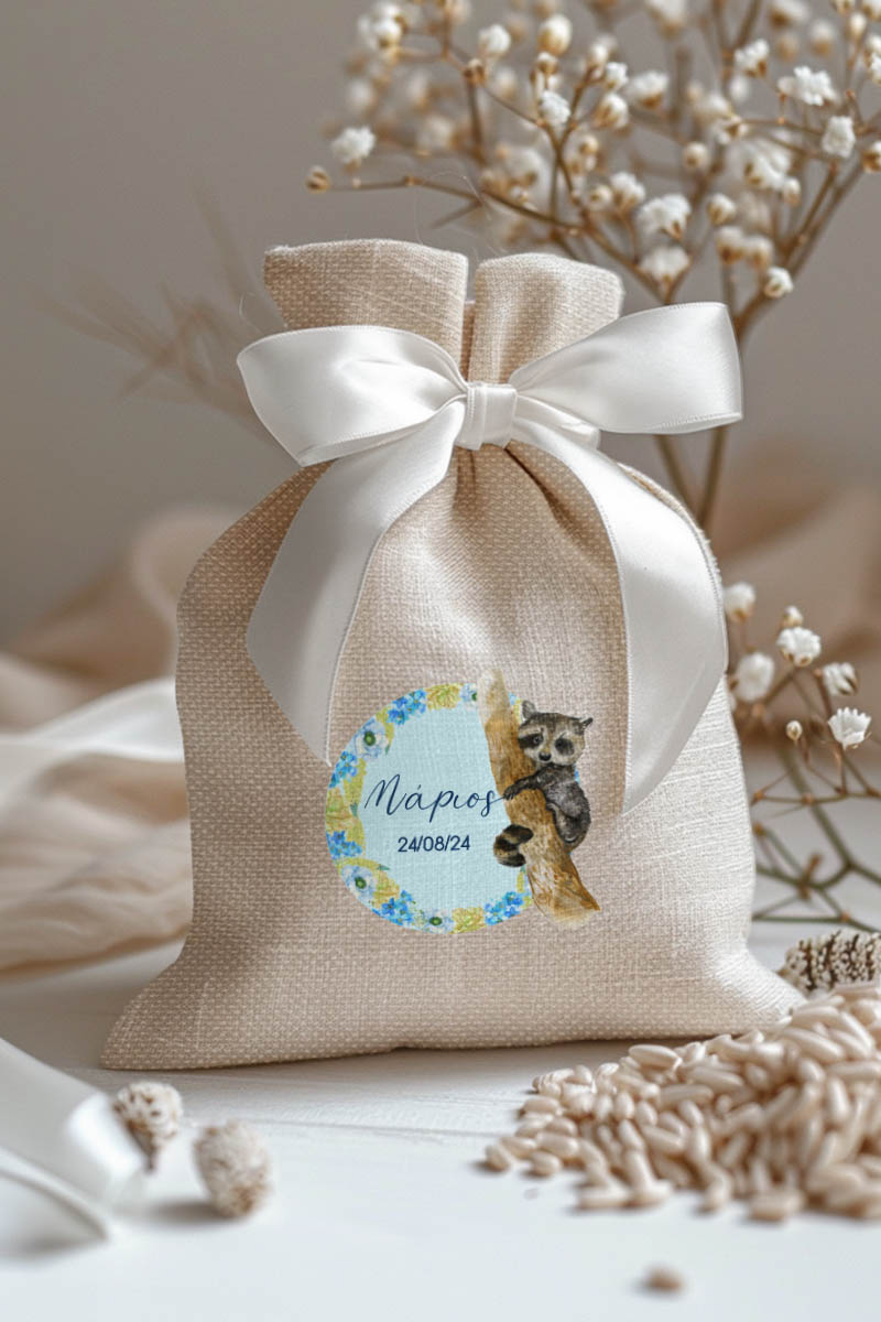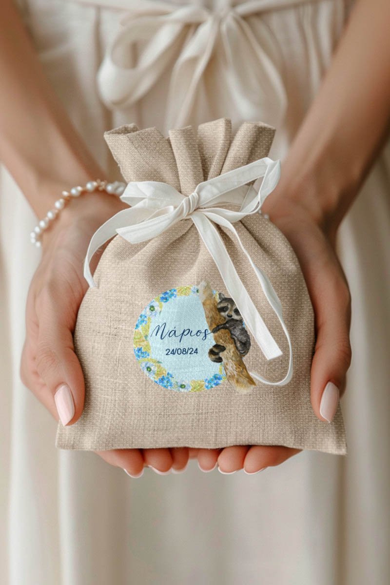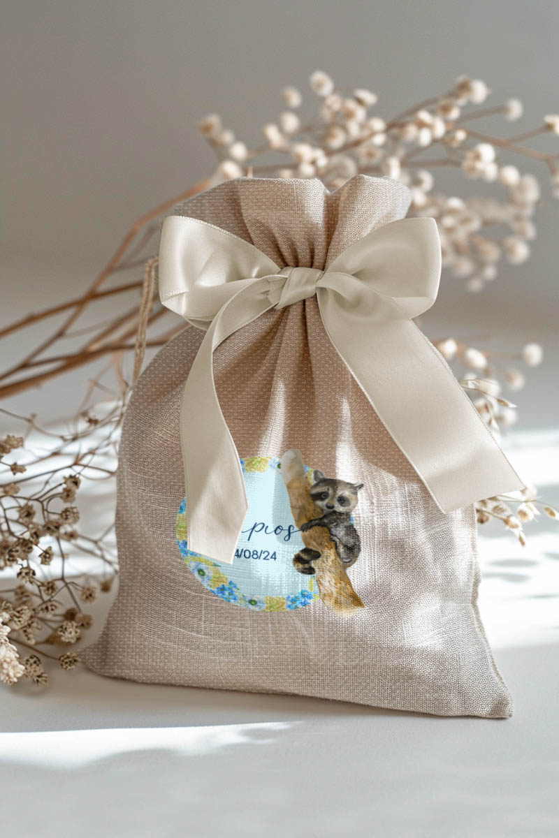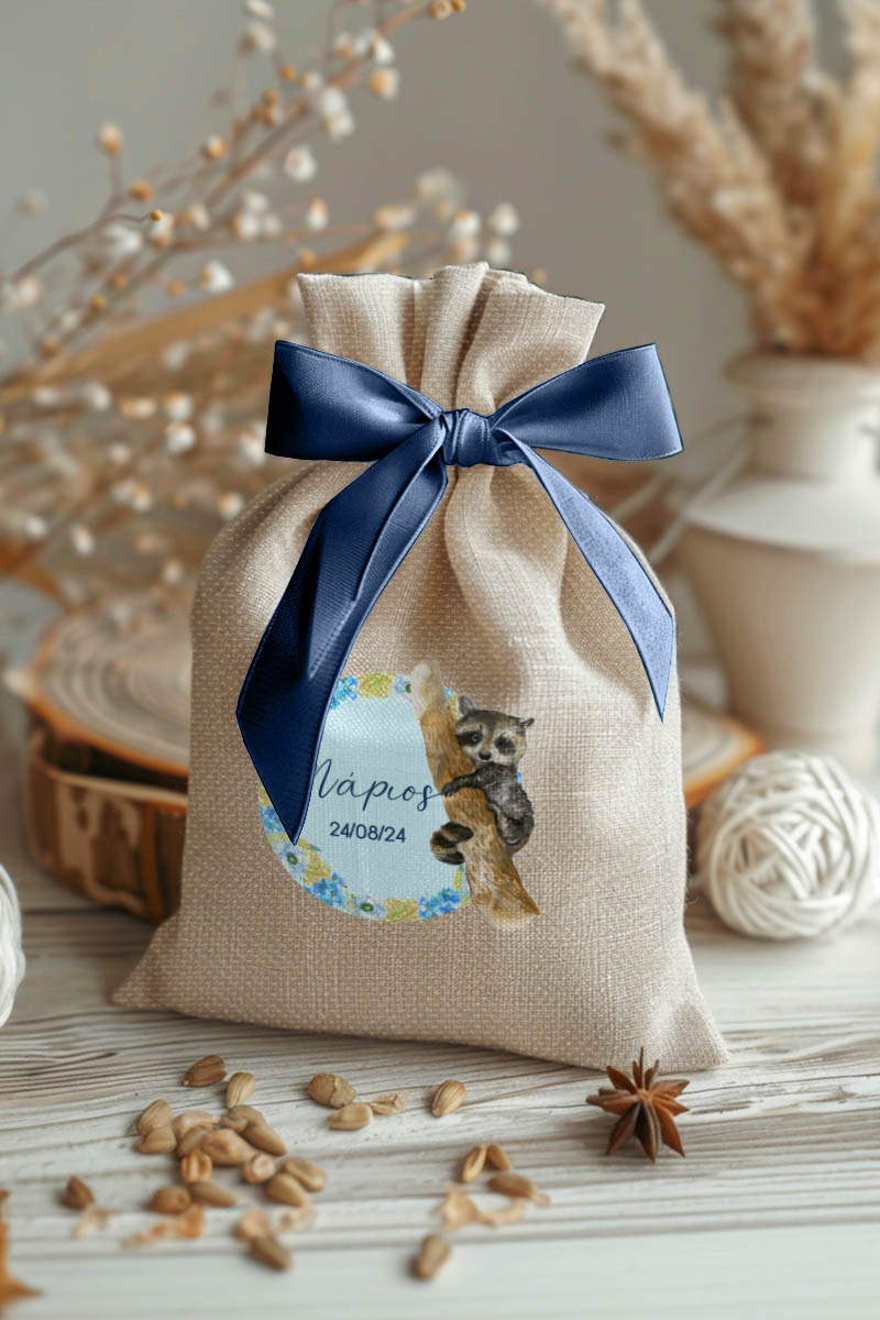 Μπομπονιέρες Βάπτισης με Πουγκί από Καμβά σε Εκρού Χρώμα με σχέδιο Μπλε Δάσος