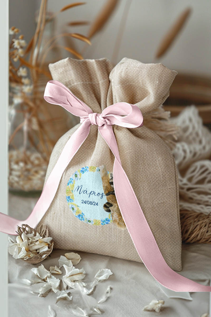 • Κάθε σετ μπομπονιέρας περιλαμβάνει ένα προσωποποιημένο πουγκί από ύφανση καμβά, με δυνατότητα επιλογής χρώματος και σχεδίου.
