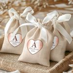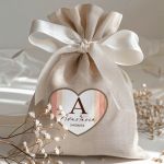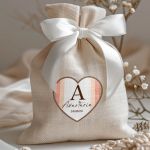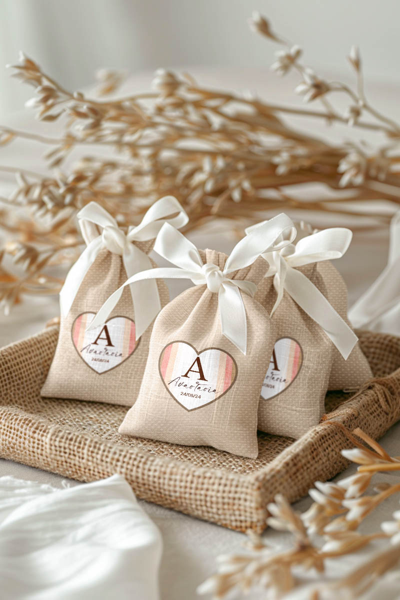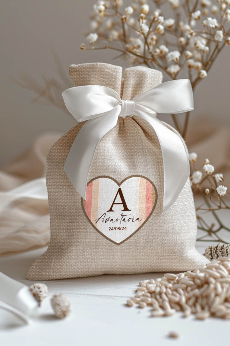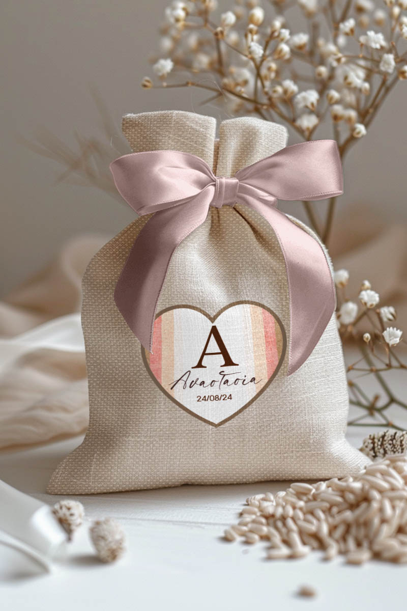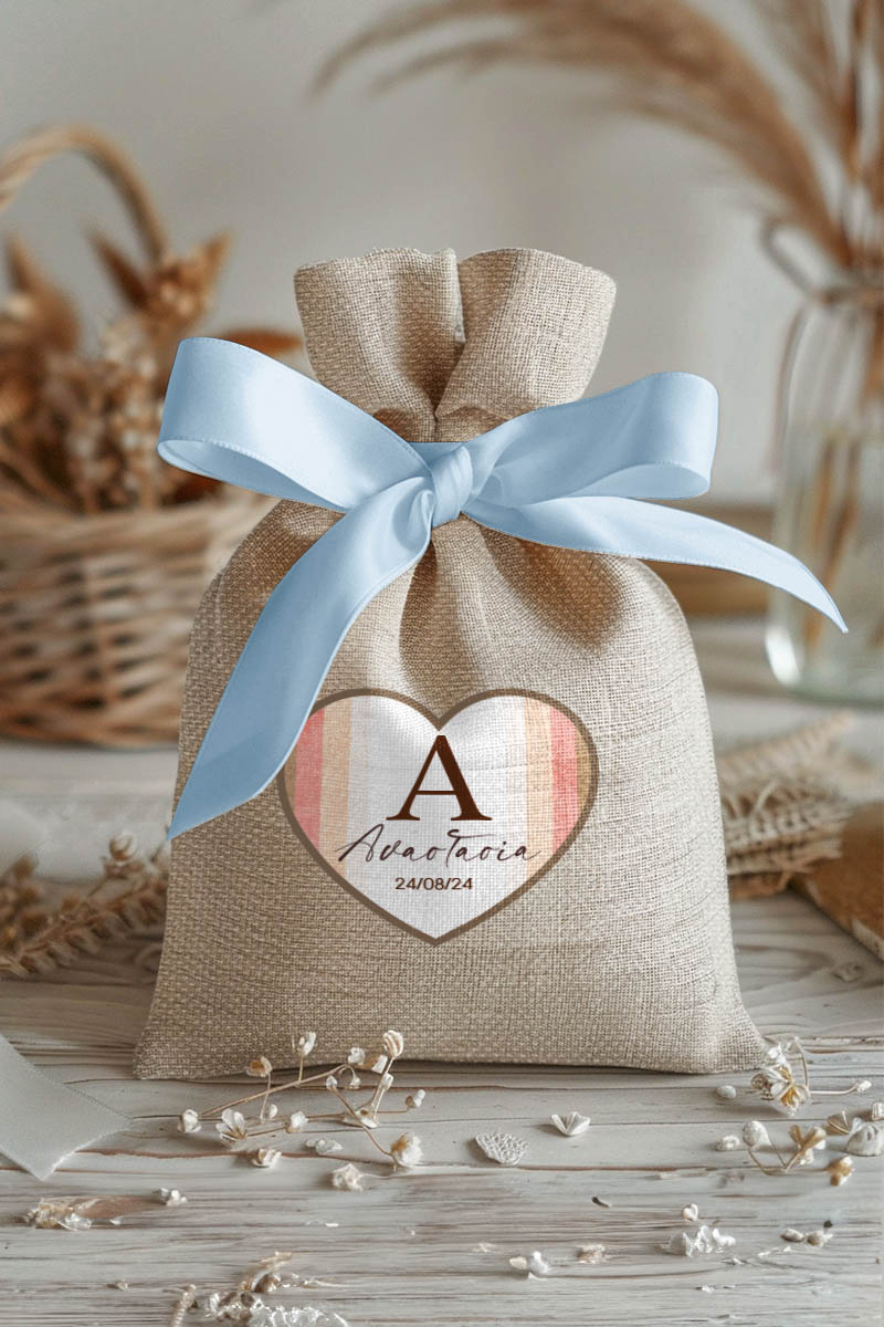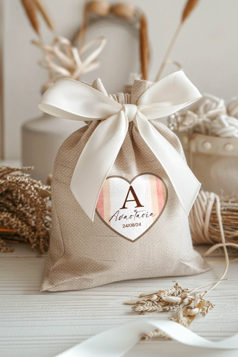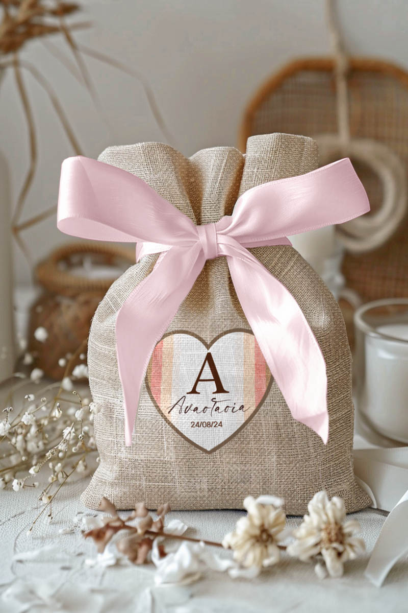 • Κάθε σετ μπομπονιέρας περιλαμβάνει ένα προσωποποιημένο πουγκί από ύφανση καμβά, με δυνατότητα επιλογής χρώματος και σχεδίου.