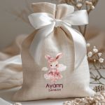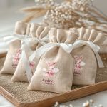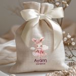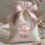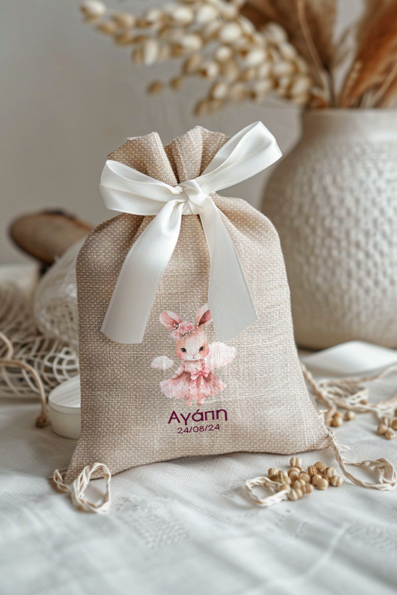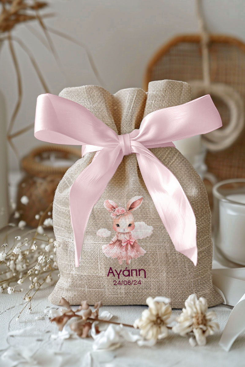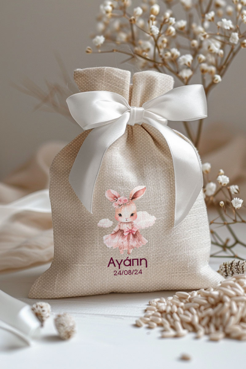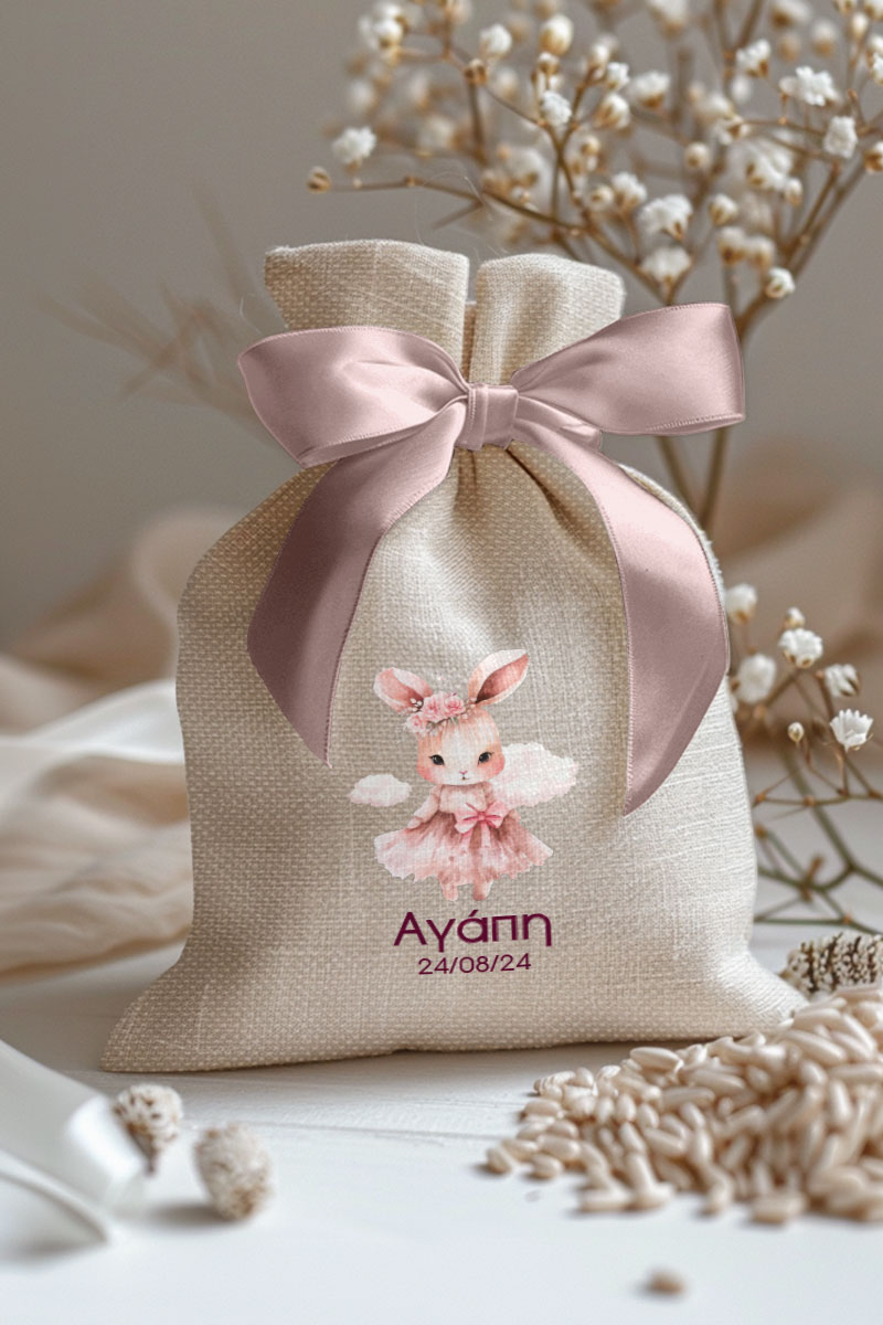 Μπομπονιέρες Βάπτισης με Πουγκί από Καμβά σε Εκρού Χρώμα με σχέδιο Ροζ Λαγουδάκι