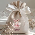 Μπομπονιέρες Βάπτισης Πουγκί σε Εκρού Χρώμα με Σχέδιο Ροζ Λαγουδάκι