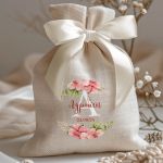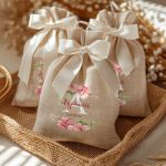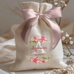 Μπομπονιέρες Βάπτισης με Πουγκί από Καμβά σε Εκρού Χρώμα με σχέδιο Ροζ Λουλουδάκια