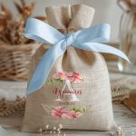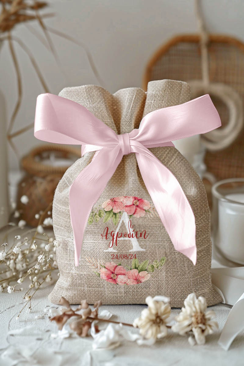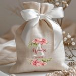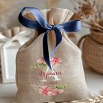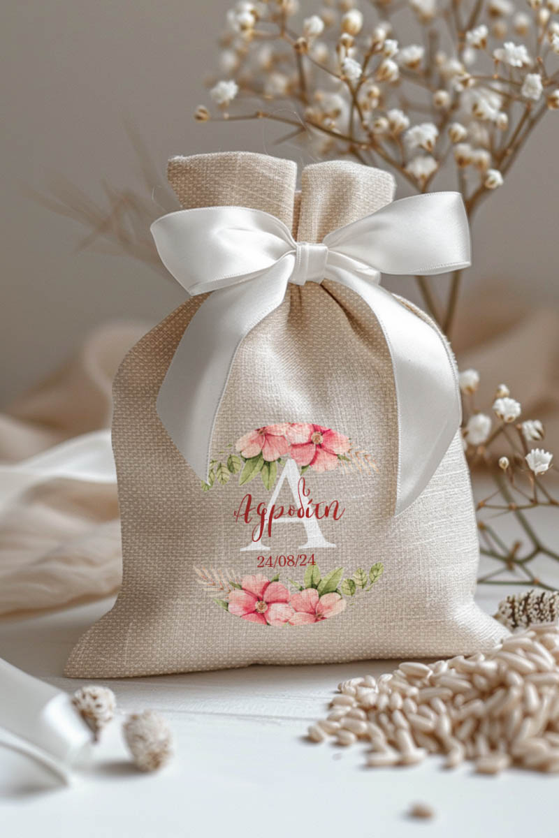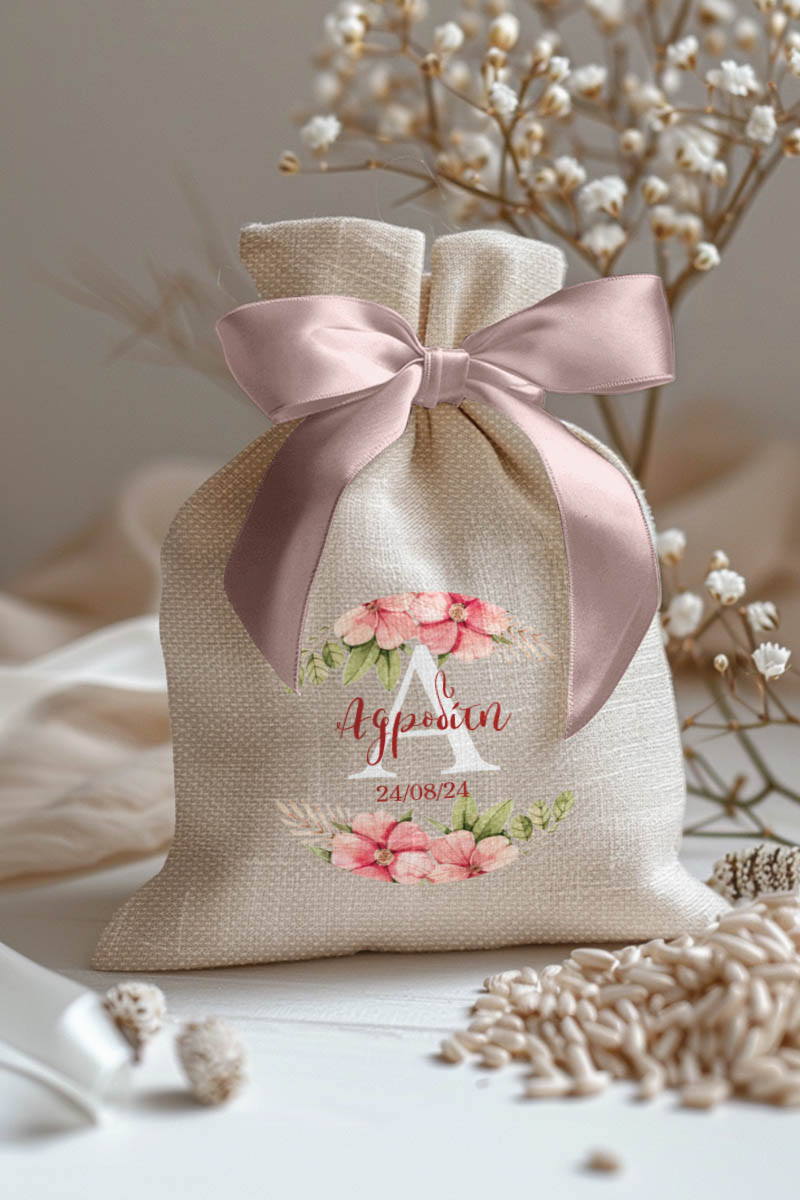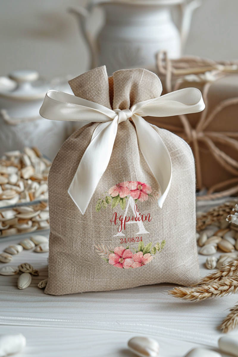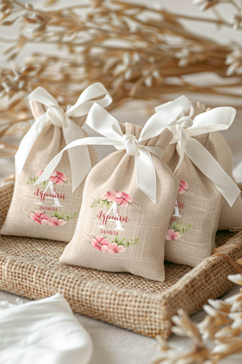 • Κάθε σετ μπομπονιέρας περιλαμβάνει ένα προσωποποιημένο πουγκί από ύφανση καμβά, με δυνατότητα επιλογής χρώματος και σχεδίου.