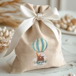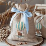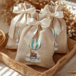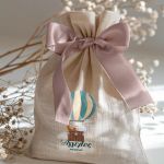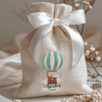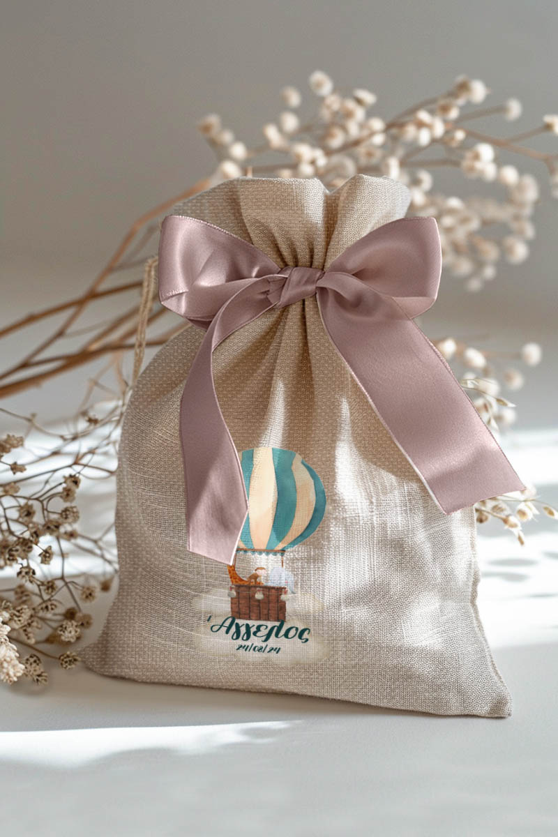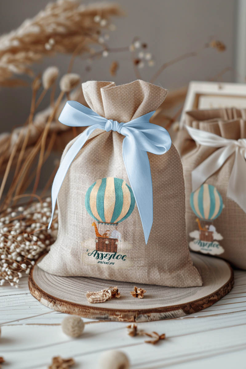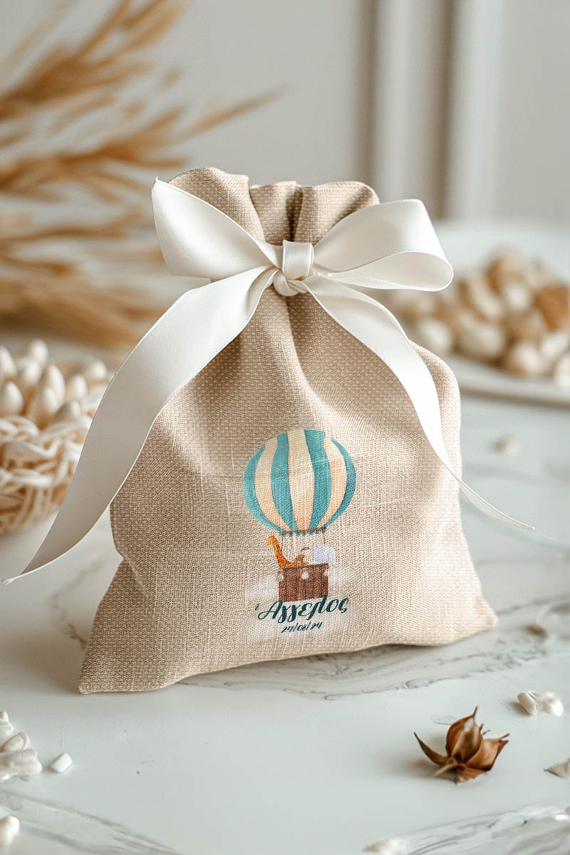 Μπομπονιέρες Βάπτισης με Πουγκί από Καμβά σε Εκρού Χρώμα με σχέδιο Ζωάκια σε Αερόστατο