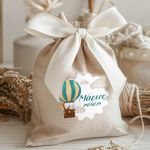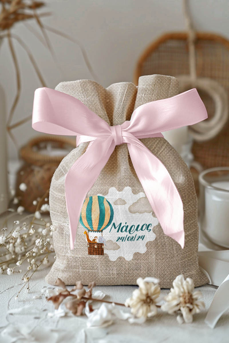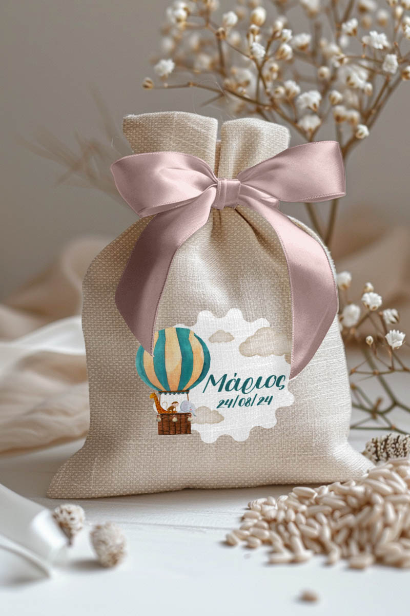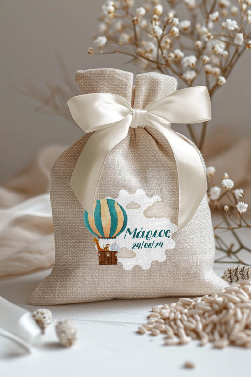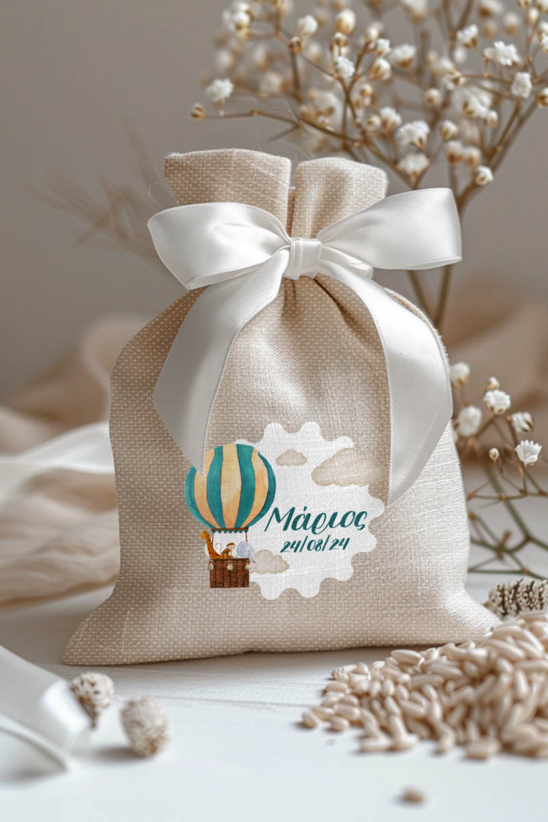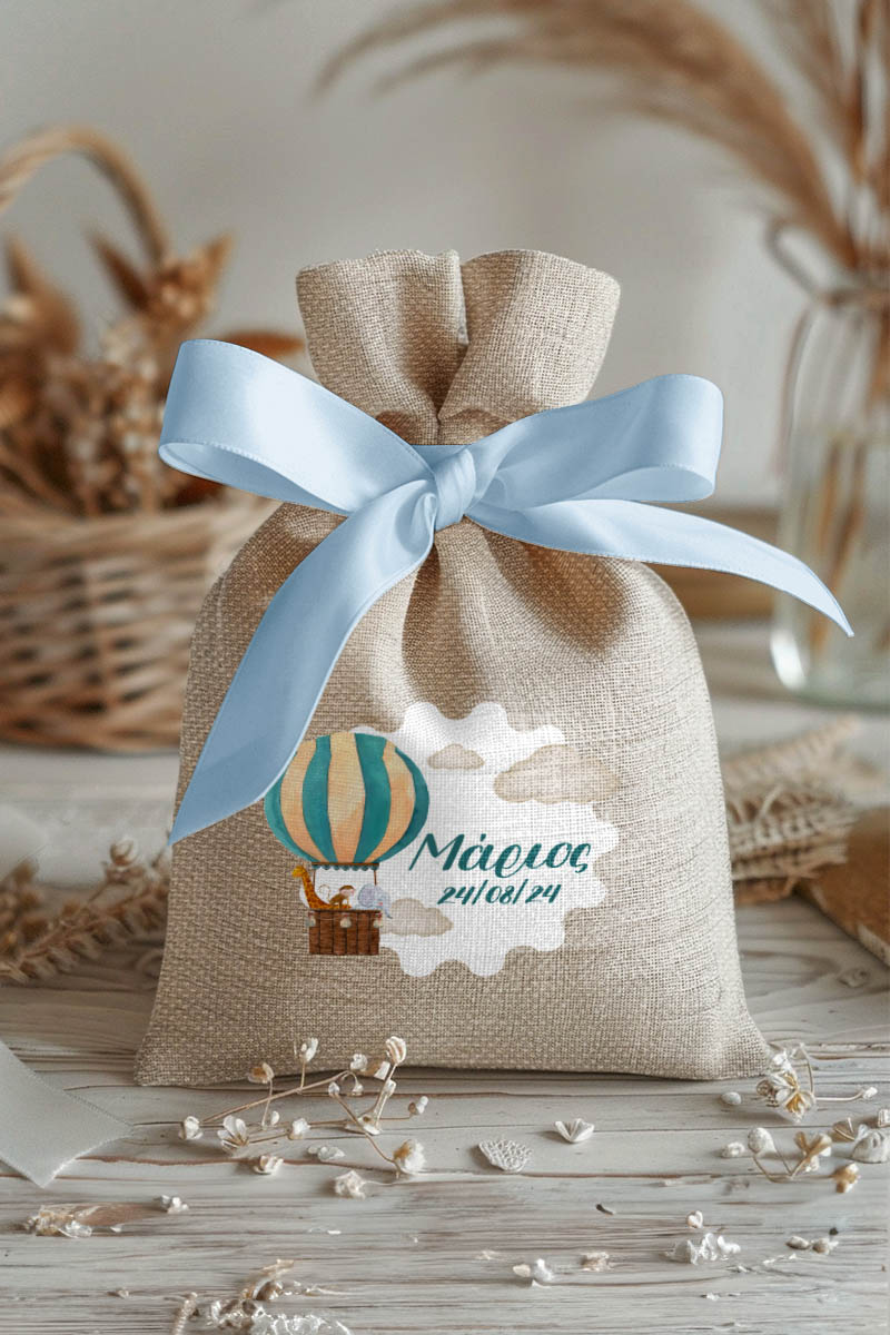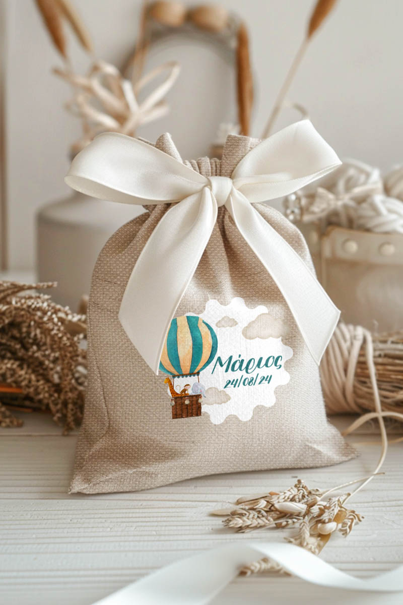 Μπομπονιέρες Βάπτισης με Πουγκί από Καμβά σε Εκρού Χρώμα με σχέδιο Ζωάκια στον Ουρανό
