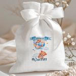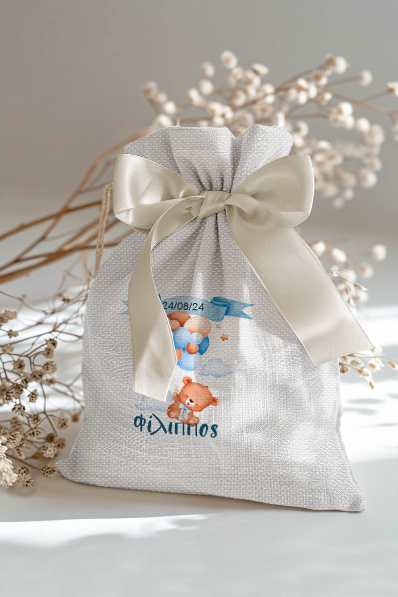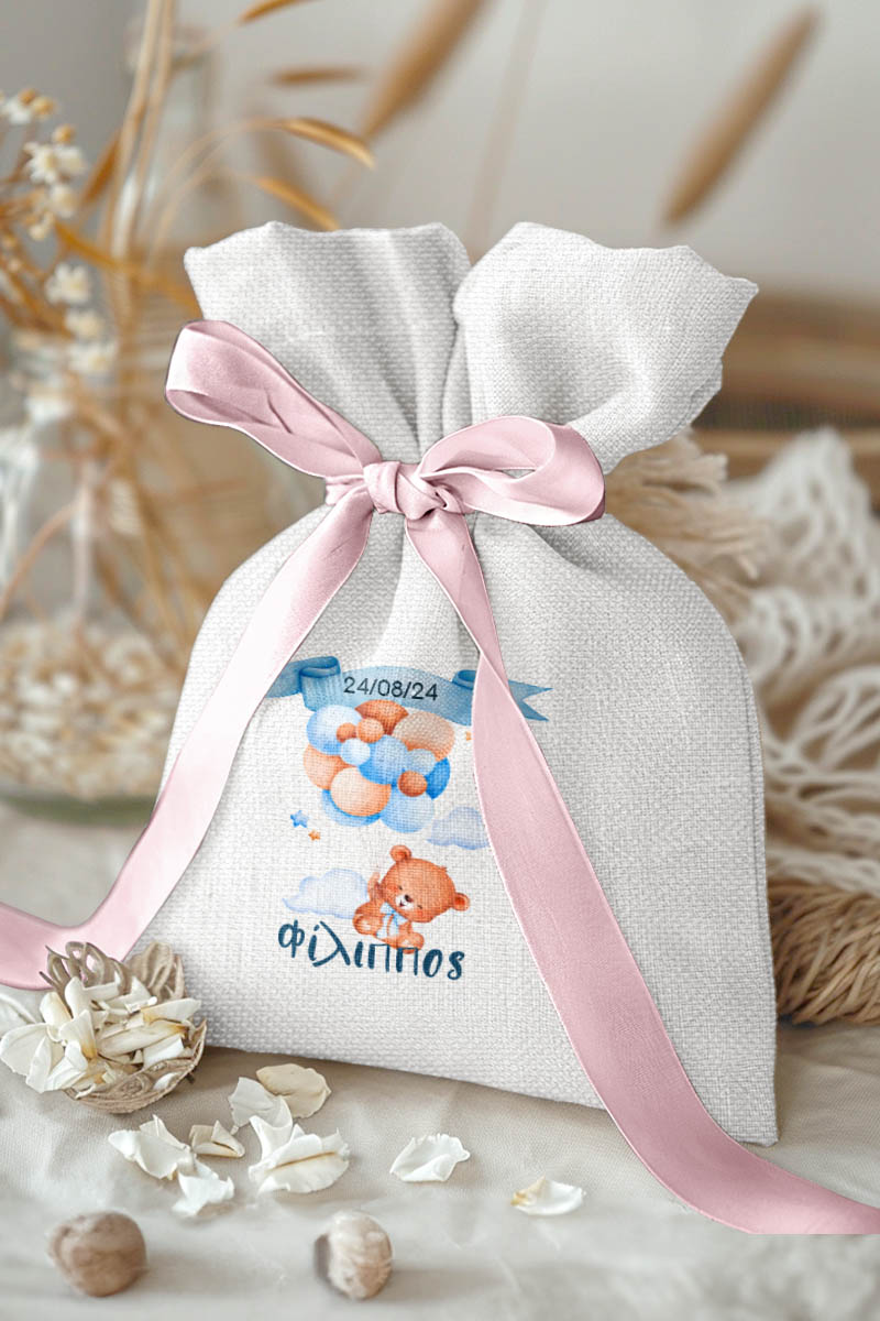 Μπομπονιέρες Βάπτισης με Πουγκί από Καμβά σε Λευκό Χρώμα με σχέδιο Αρκουδάκι στον Αέρα