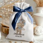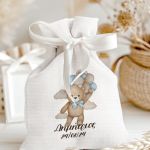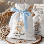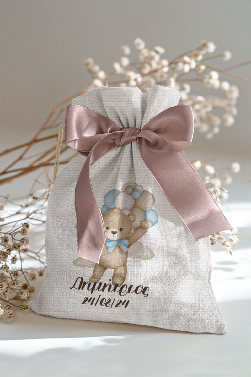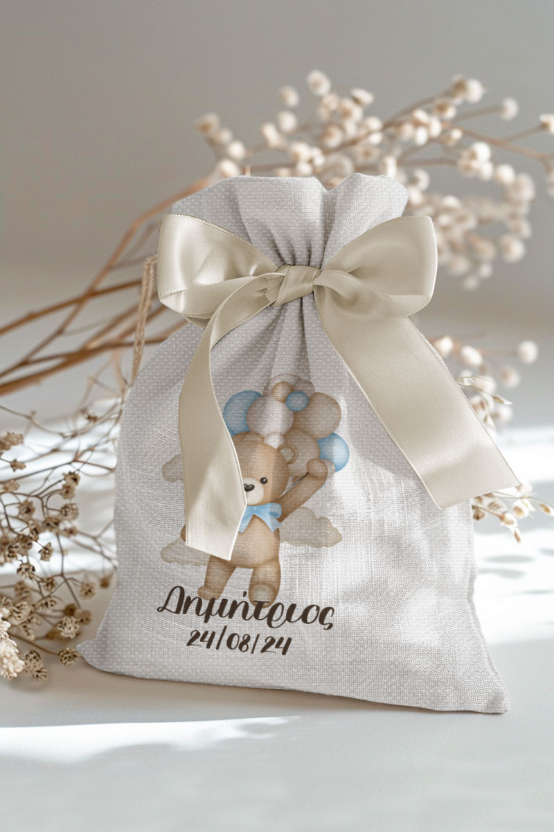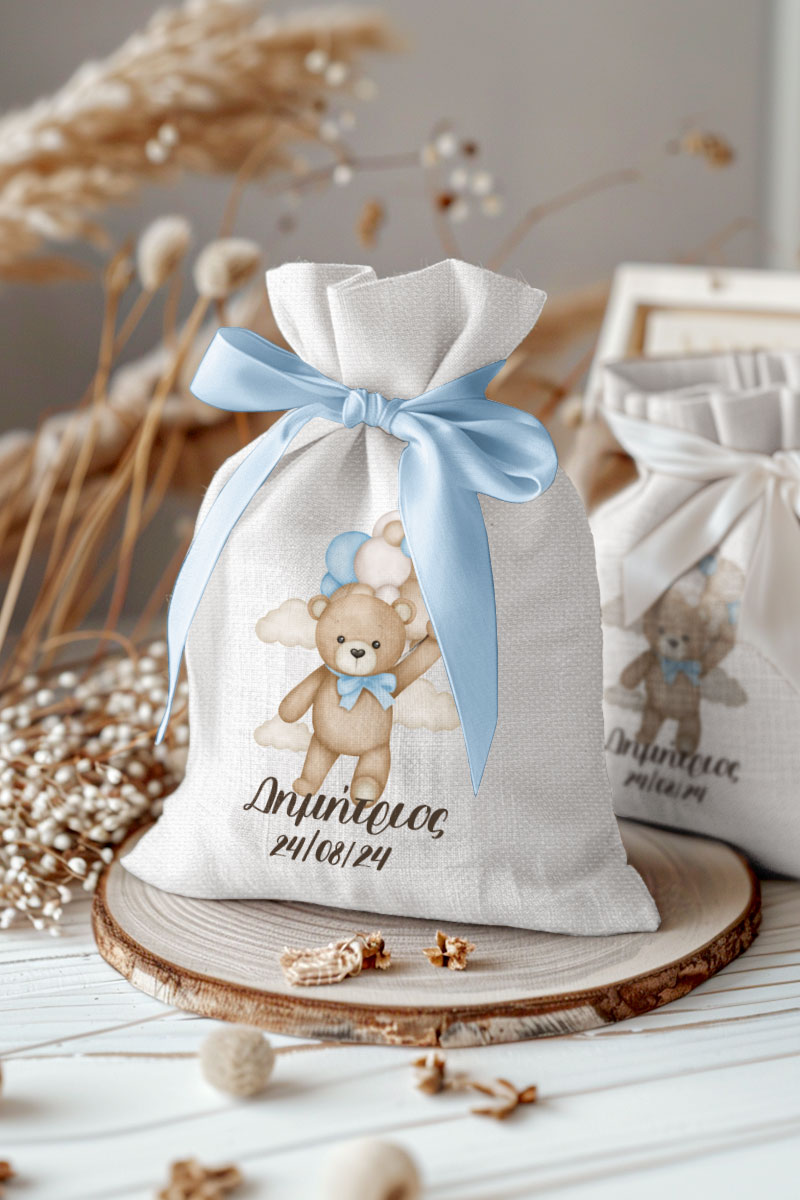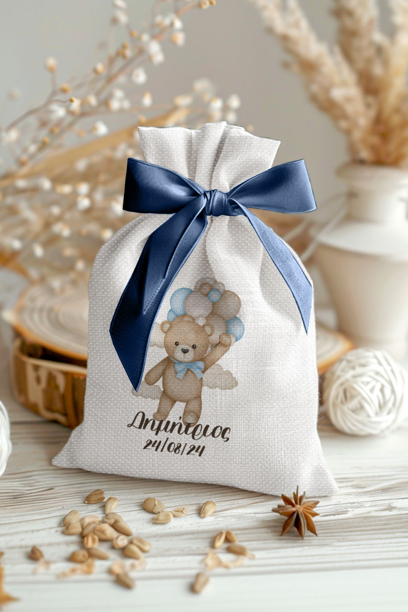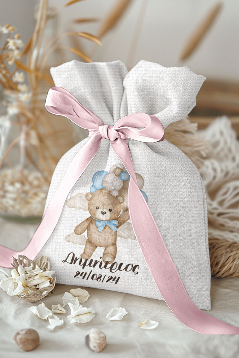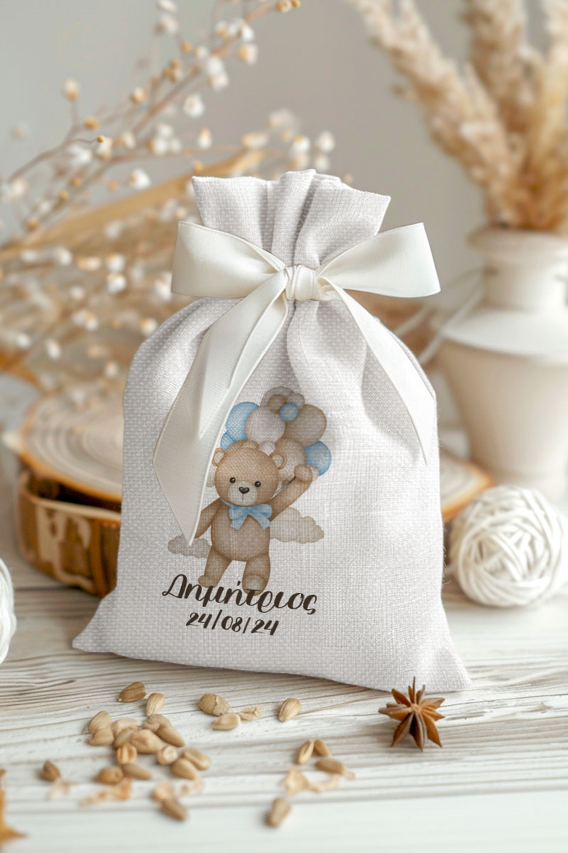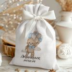 Μπομπονιέρες Βάπτισης με Πουγκί από Καμβά σε Λευκό Χρώμα με σχέδιο Αρκουδάκι με Μπλε Μπαλόνια