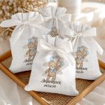 - Κάθε σετ μπομπονιέρας περιλαμβάνει ένα προσωποποιημένο πουγκί από ύφανση καμβά, με δυνατότητα επιλογής χρώματος και σχεδίου.