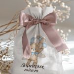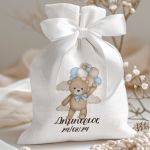 Μπομπονιέρες Βάπτισης Πουγκί σε Λευκό Χρώμα με Σχέδιο Αρκουδάκι με Μπλε Μπαλόνια