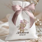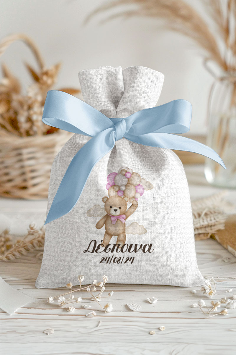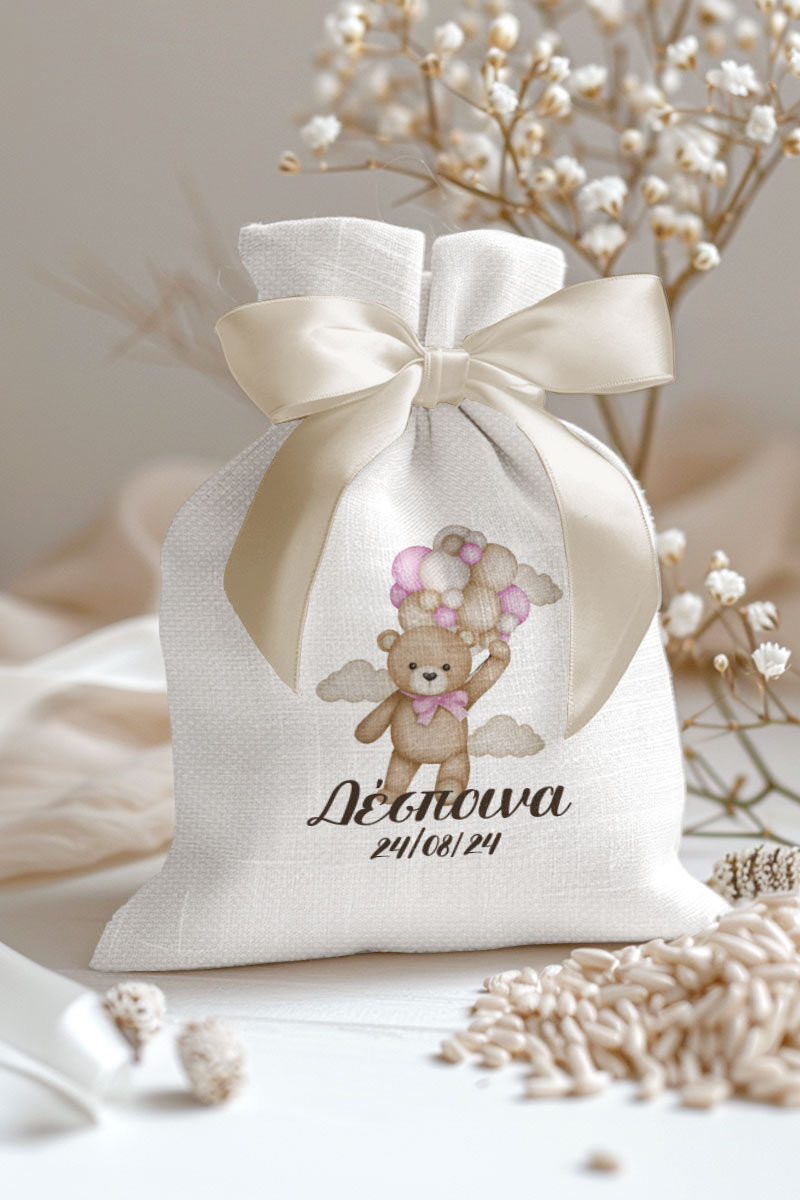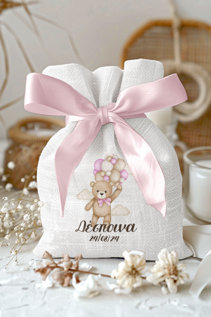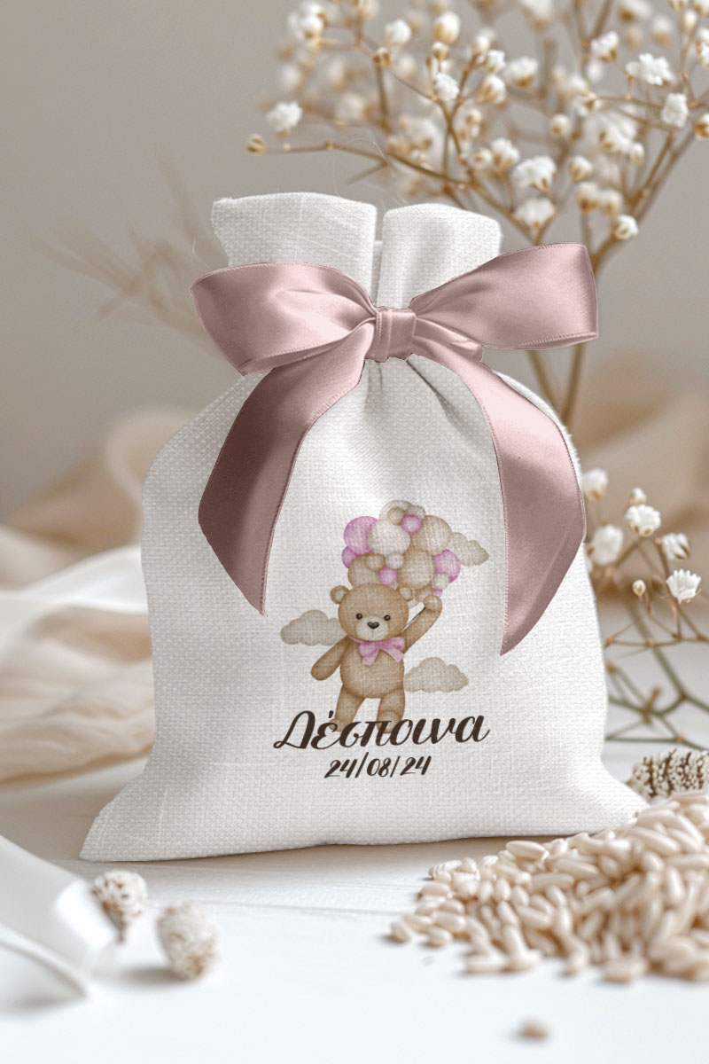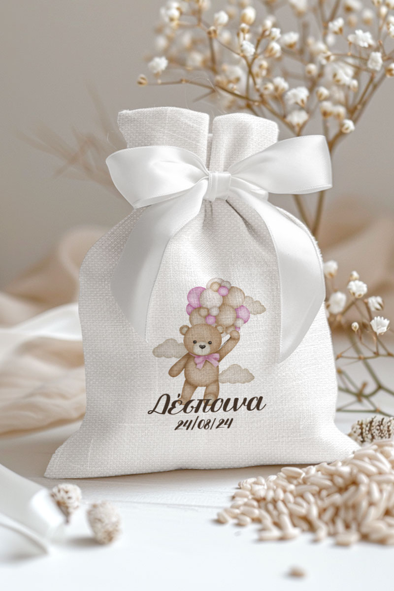 Μπομπονιέρες Βάπτισης με Πουγκί από Καμβά σε Λευκό Χρώμα με σχέδιο Αρκουδάκι με Ροζ Μπαλόνια