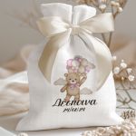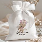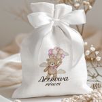 Μπομπονιέρες Βάπτισης Πουγκί σε Λευκό Χρώμα με Σχέδιο Αρκουδάκι με Ροζ Μπαλόνια