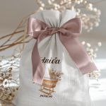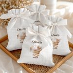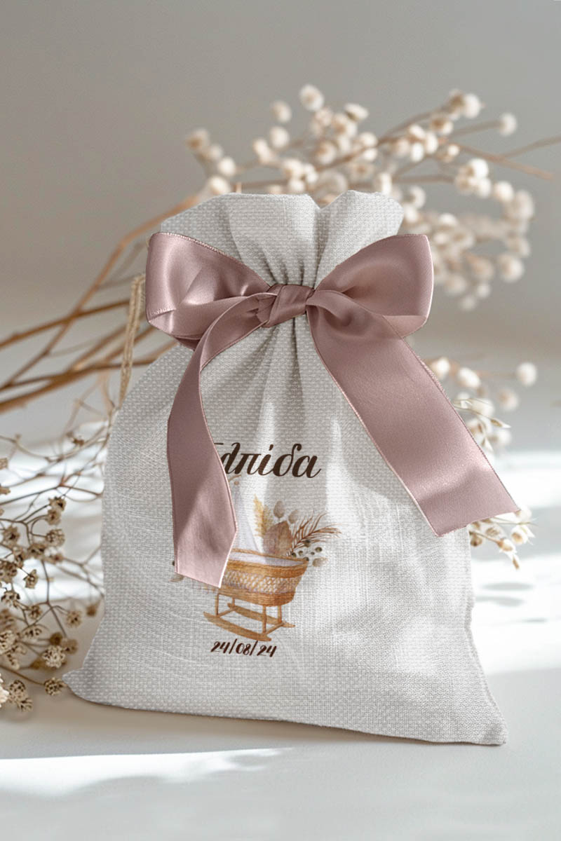 • Κάθε σετ μπομπονιέρας περιλαμβάνει ένα προσωποποιημένο πουγκί από ύφανση καμβά, με δυνατότητα επιλογής χρώματος και σχεδίου.