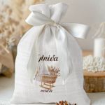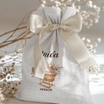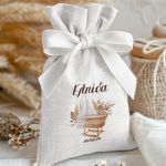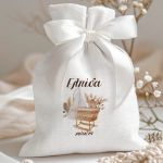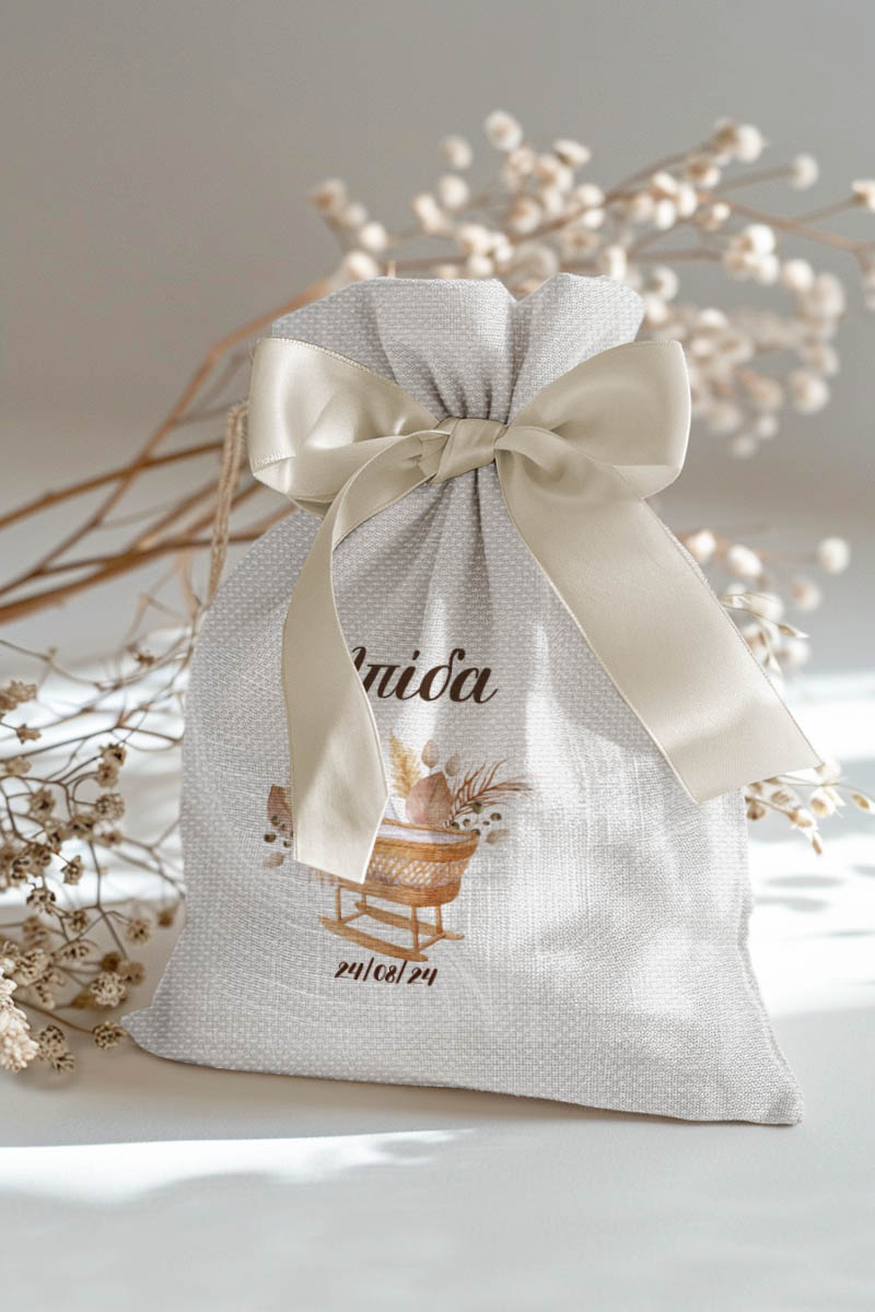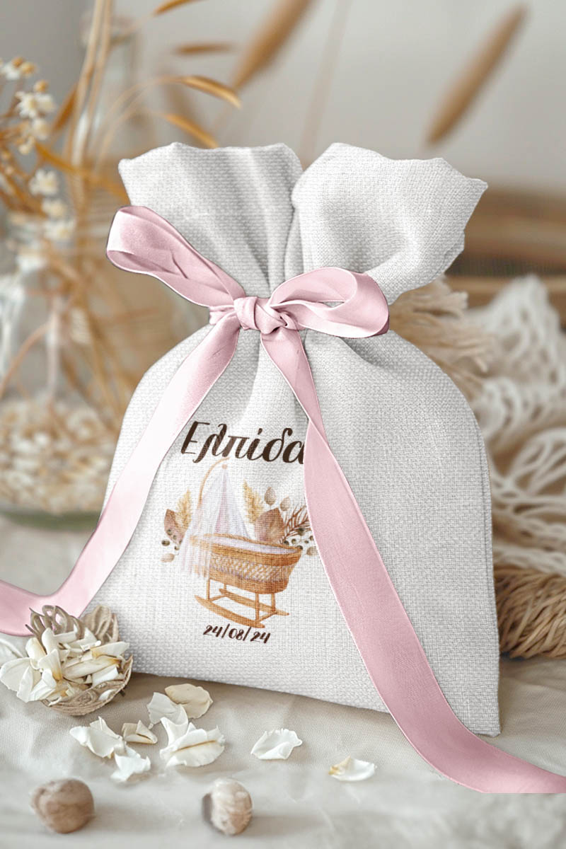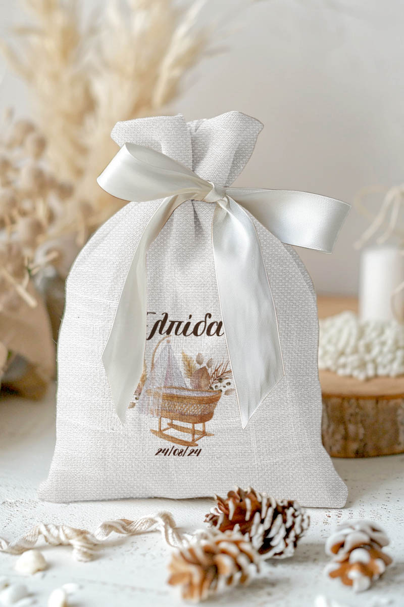 Μπομπονιέρες Βάπτισης με Πουγκί από Καμβά σε Λευκό Χρώμα με σχέδιο Boho Κούνια
