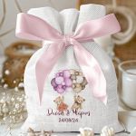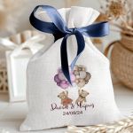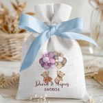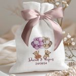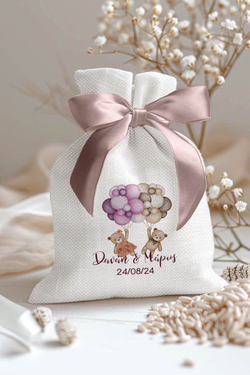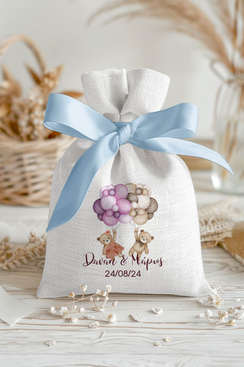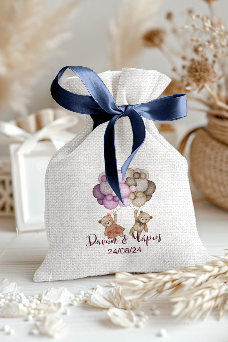 • Κάθε σετ μπομπονιέρας περιλαμβάνει ένα προσωποποιημένο πουγκί από ύφανση καμβά, με δυνατότητα επιλογής χρώματος και σχεδίου.