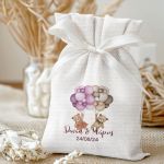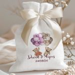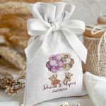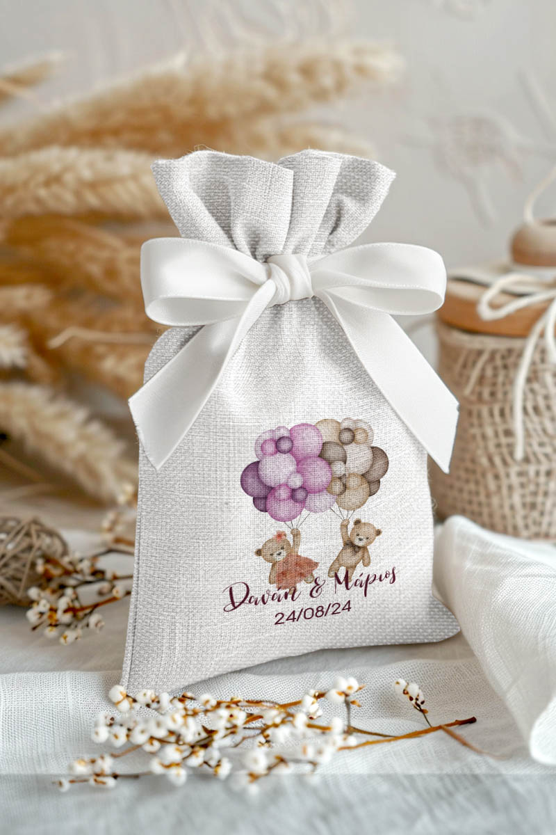 Μπομπονιέρες Βάπτισης με Πουγκί από Καμβά σε Λευκό Χρώμα με σχέδιο Δίδυμα Αρκουδάκια Μπαλόνια