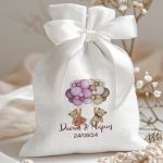 Μπομπονιέρες Βάπτισης Πουγκί σε Λευκό Χρώμα με Σχέδιο Δίδυμα Αρκουδάκια Μπαλόνια