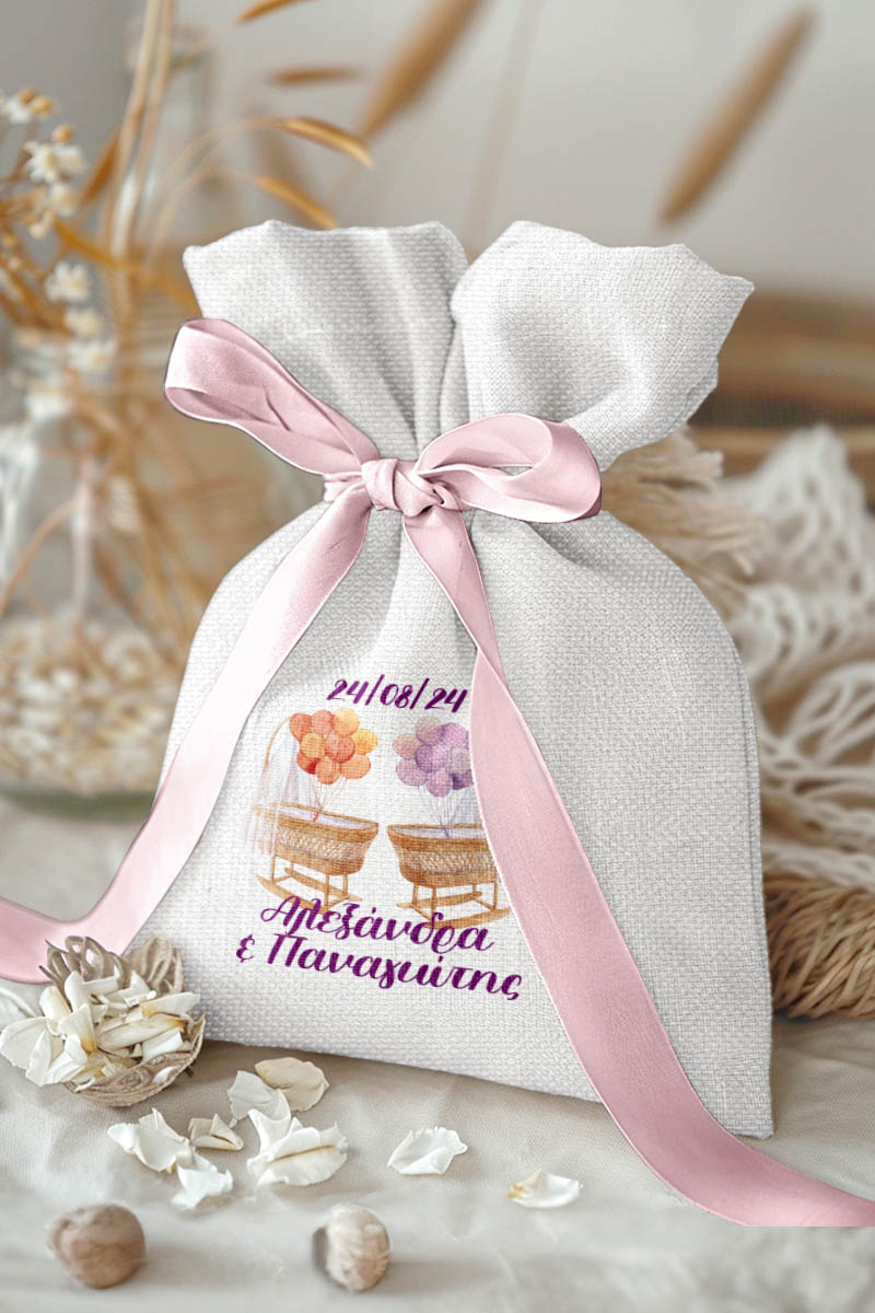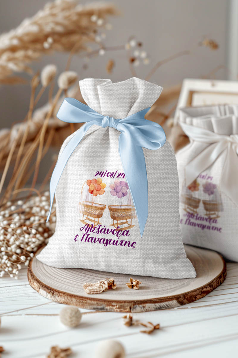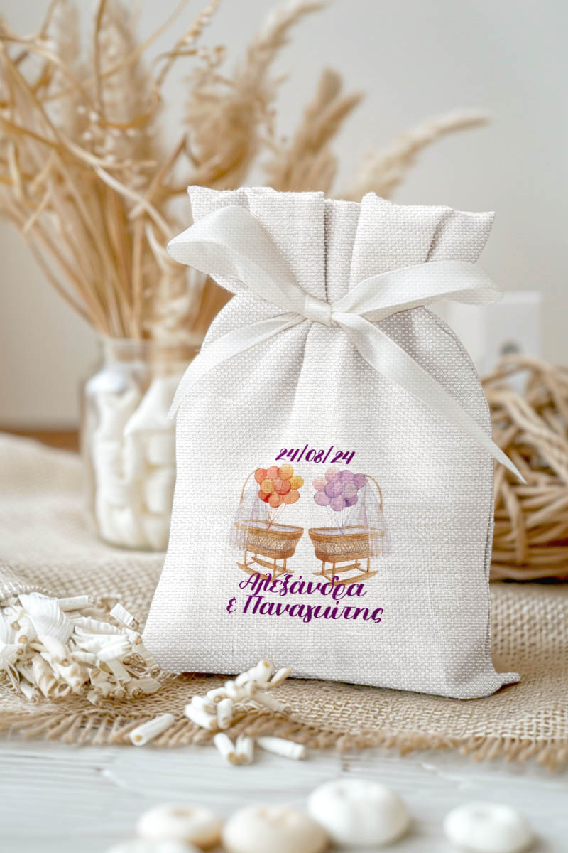 Μπομπονιέρες Βάπτισης με Πουγκί από Καμβά σε Λευκό Χρώμα με σχέδιο Δίδυμες Κούνιες