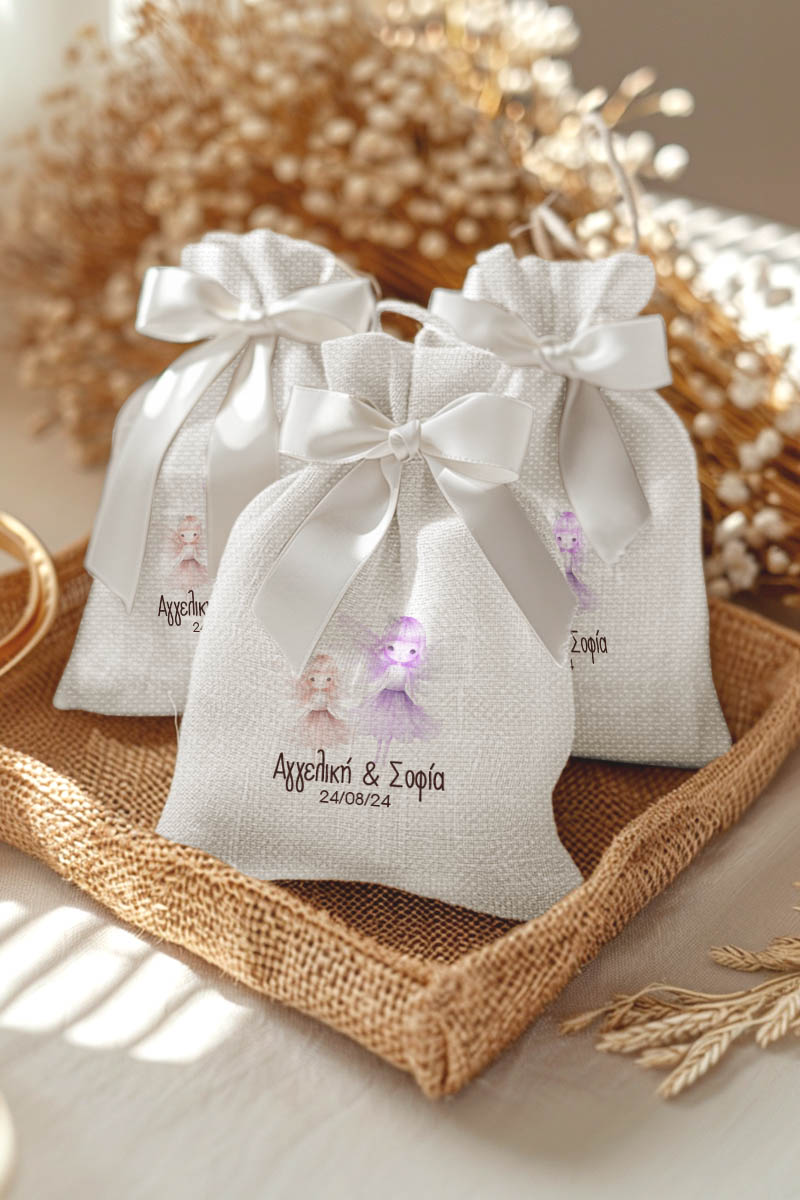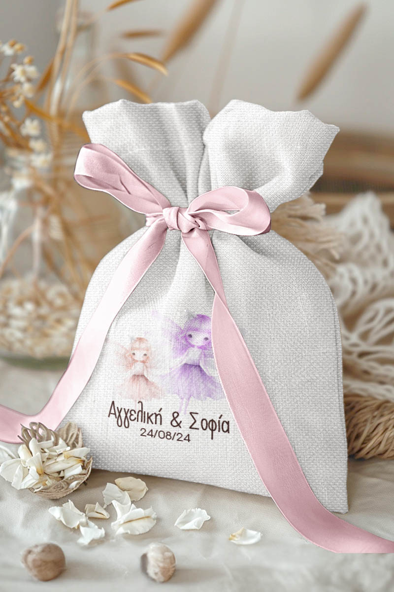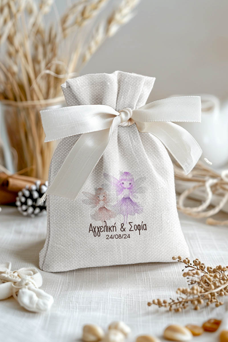 Μπομπονιέρες Βάπτισης με Πουγκί από Καμβά σε Λευκό Χρώμα με σχέδιο Δίδυμες Νεράιδες