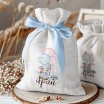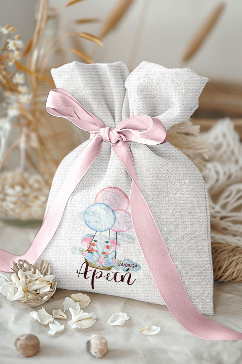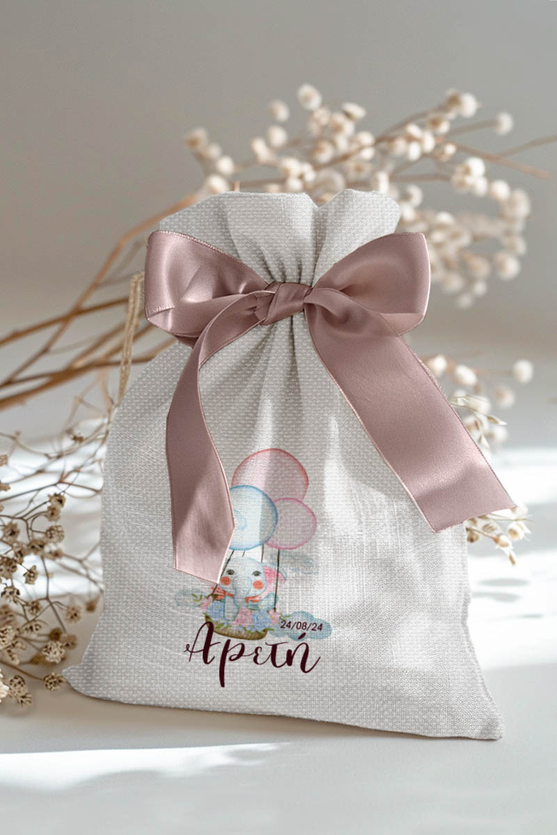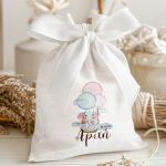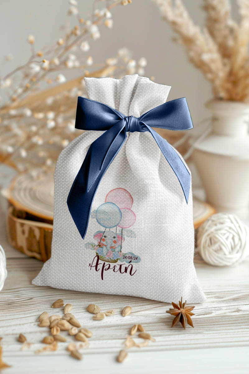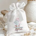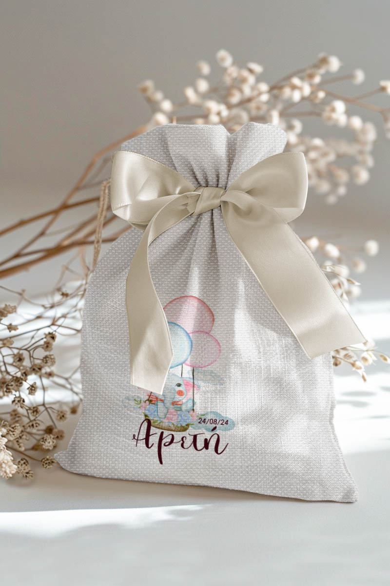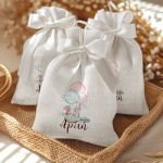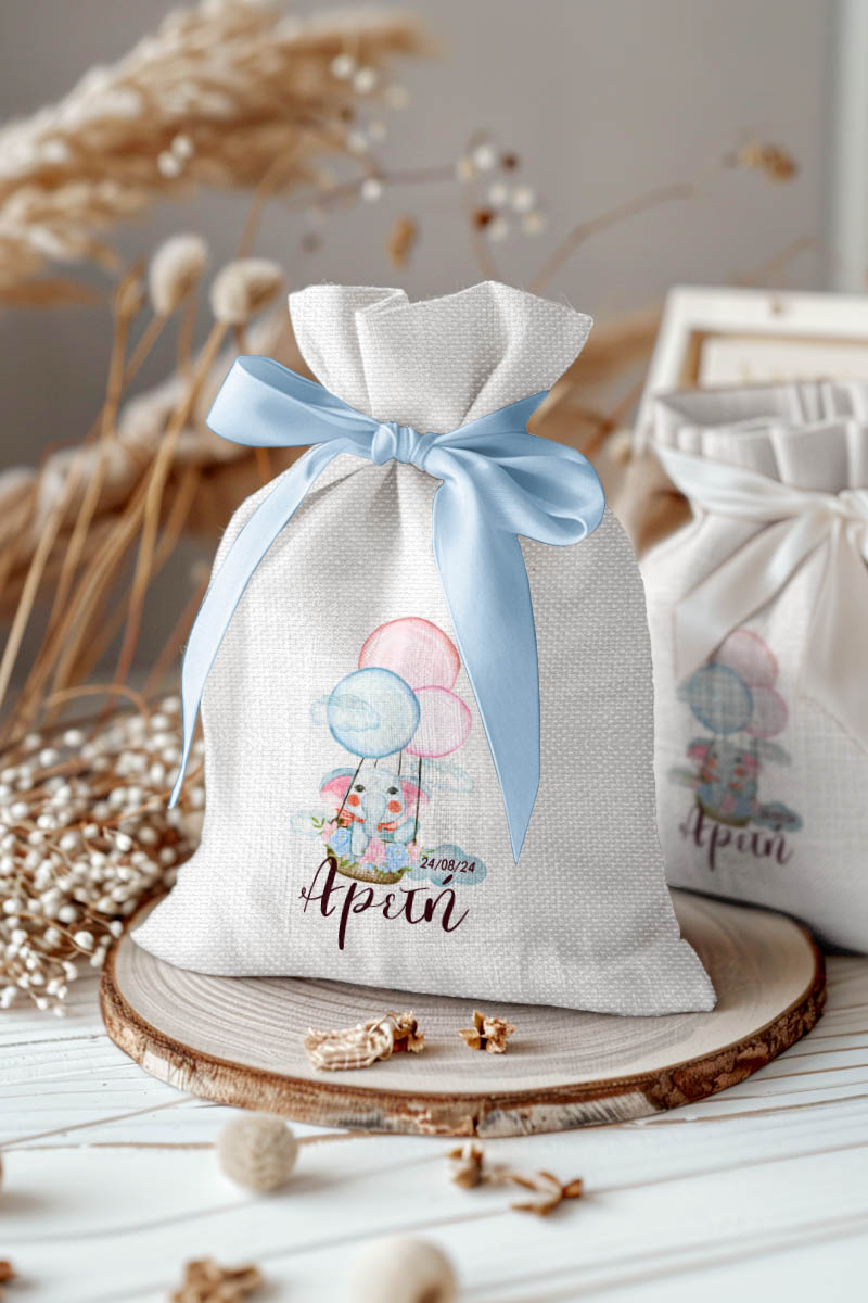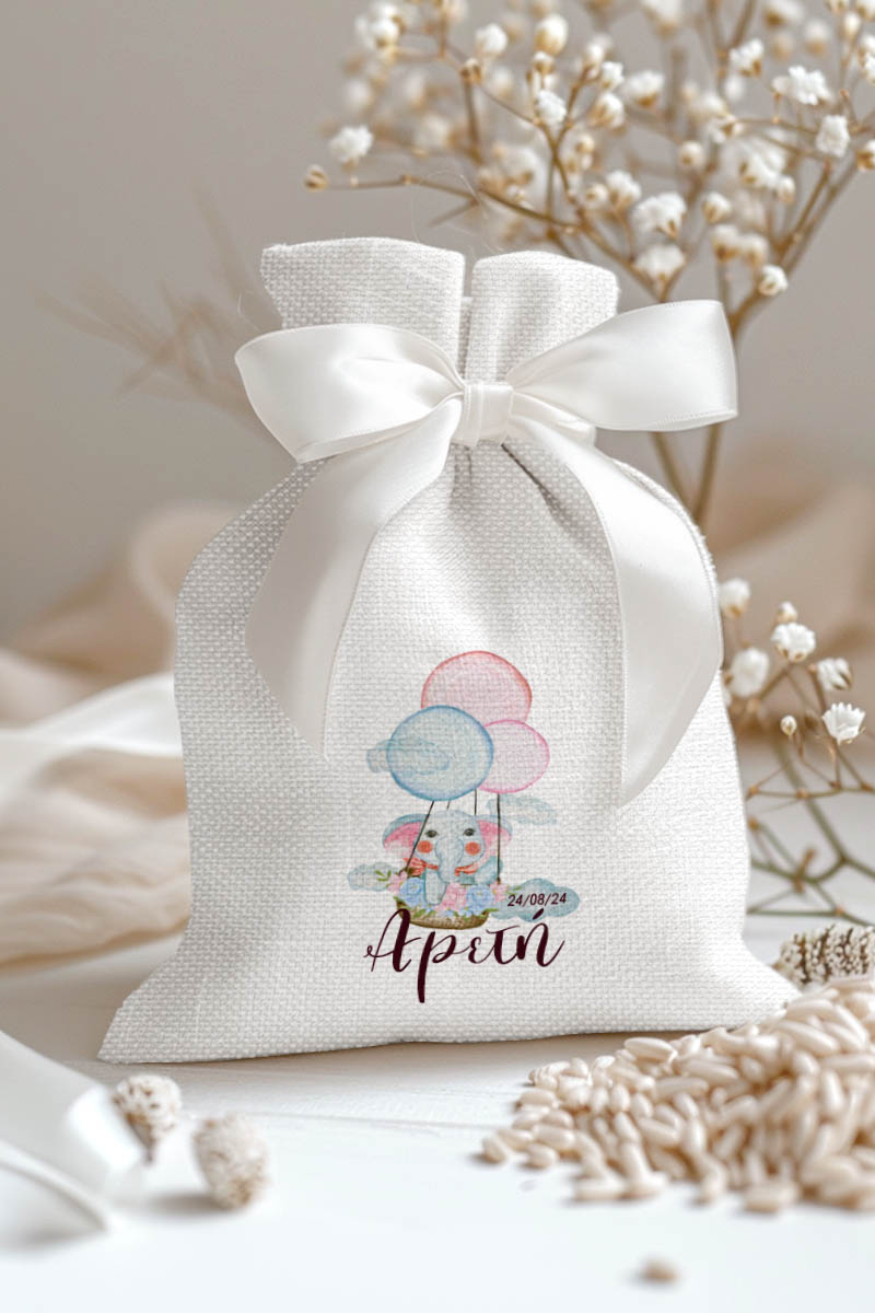 Μπομπονιέρες Βάπτισης με Πουγκί από Καμβά σε Λευκό Χρώμα με σχέδιο Ελεφαντάκι με Μπαλόνια