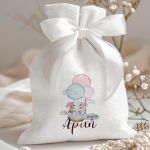 Μπομπονιέρες Βάπτισης Πουγκί σε Λευκό Χρώμα με Σχέδιο Ελεφαντάκι με Μπαλόνια