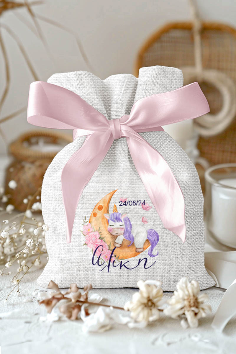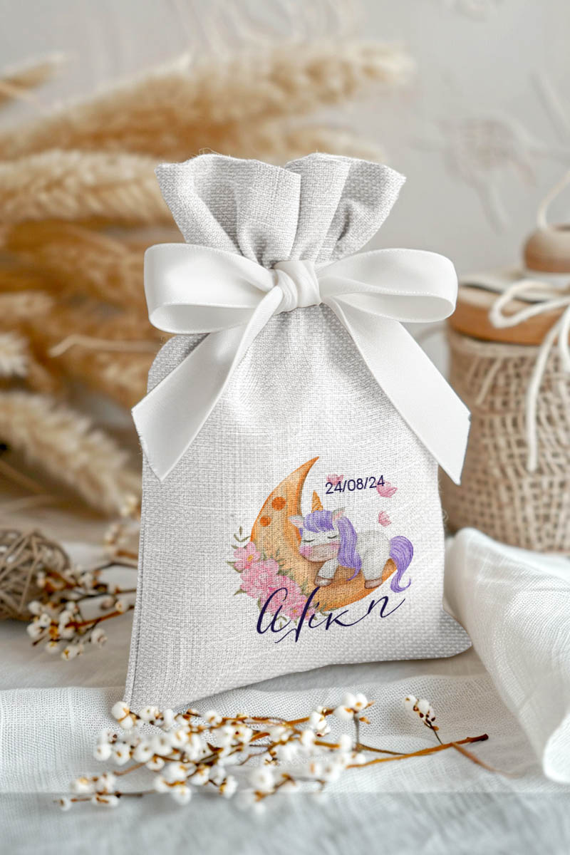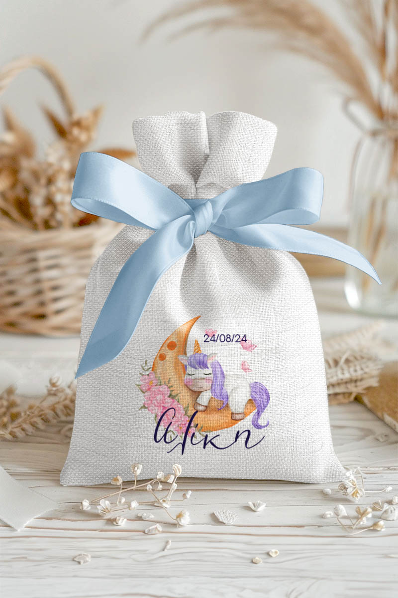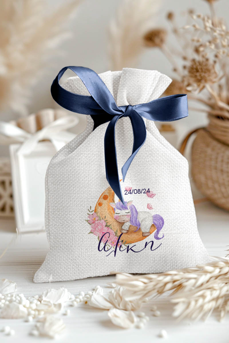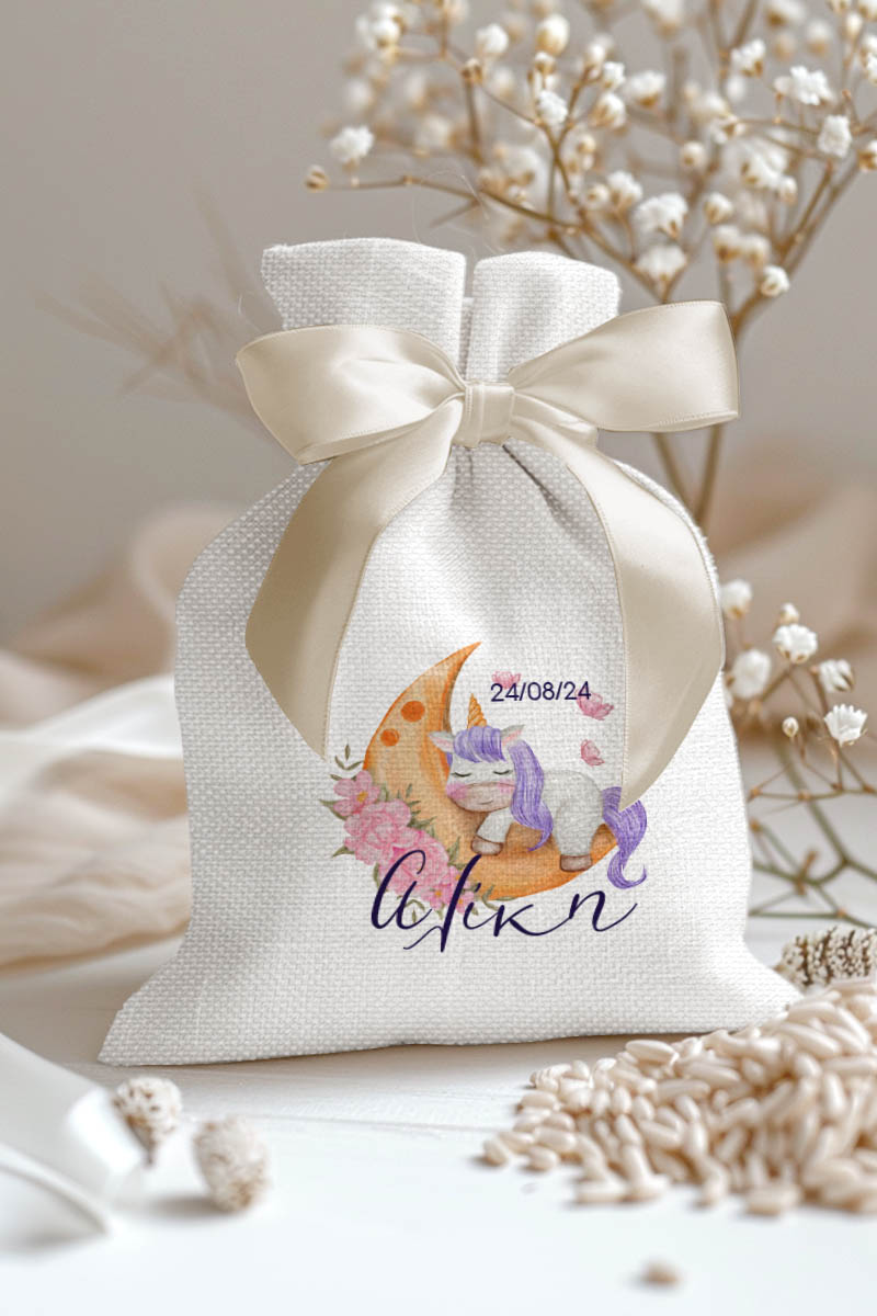 Μπομπονιέρες Βάπτισης με Πουγκί από Καμβά σε Λευκό Χρώμα με σχέδιο Μονόκερος στο Φεγγάρι