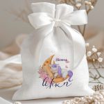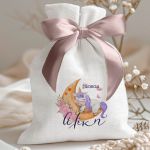 Μπομπονιέρες Βάπτισης Πουγκί σε Λευκό Χρώμα με Σχέδιο Μονόκερος στο Φεγγάρι