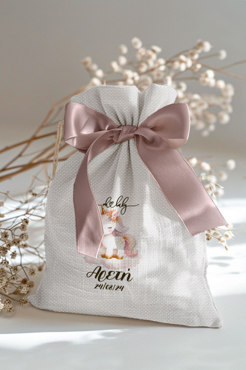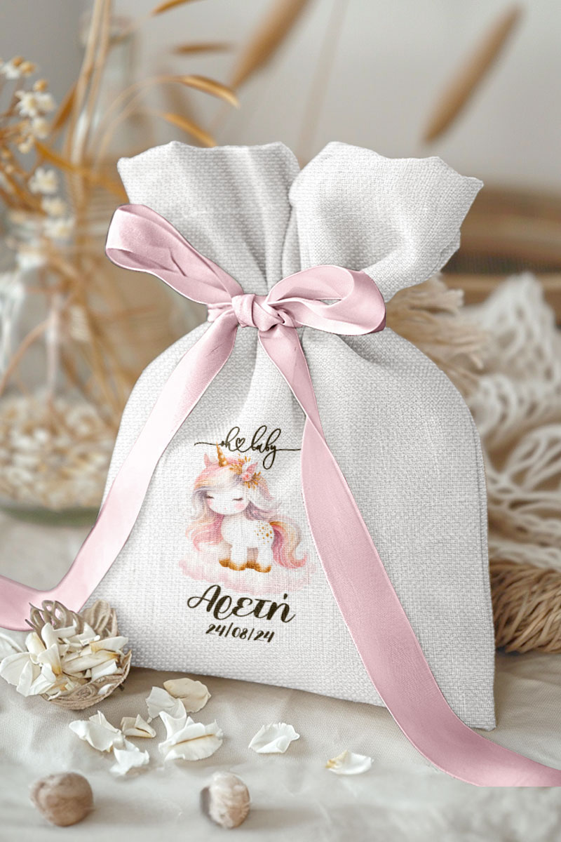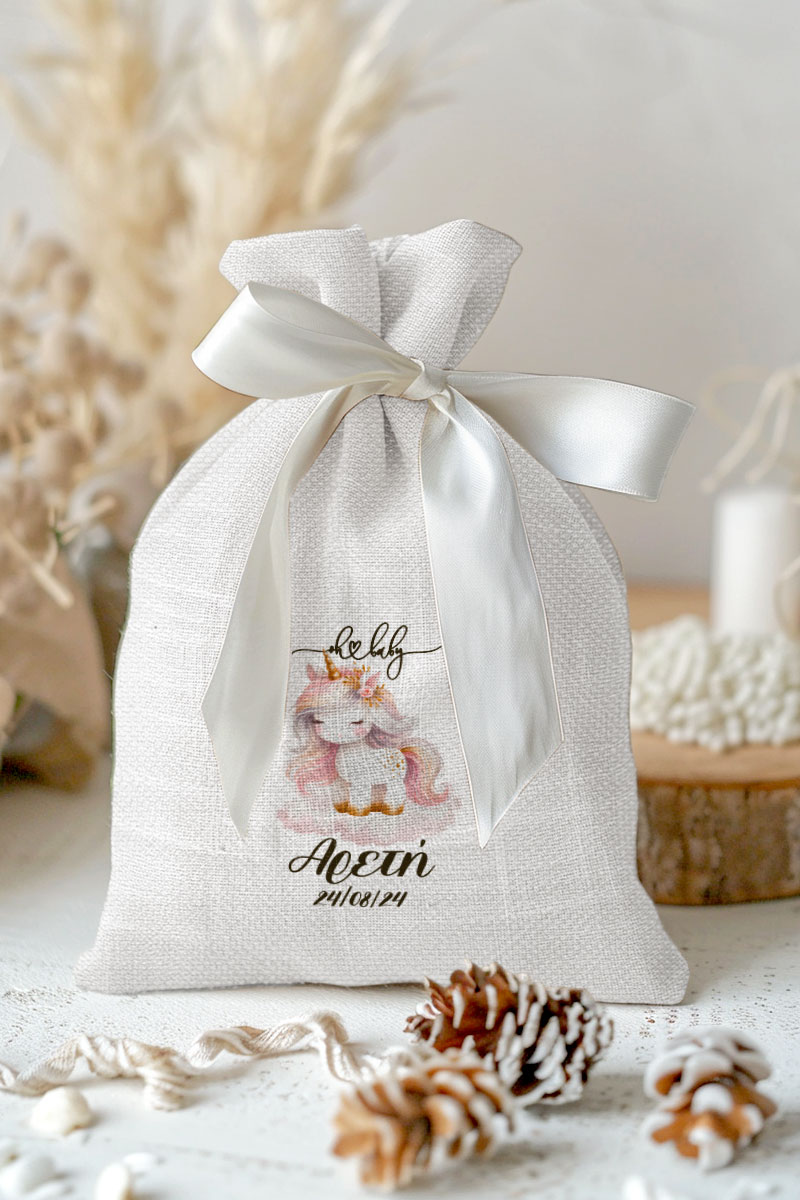 Μπομπονιέρες Βάπτισης με Πουγκί από Καμβά σε Λευκό Χρώμα με σχέδιο Ροζ Μονόκερος