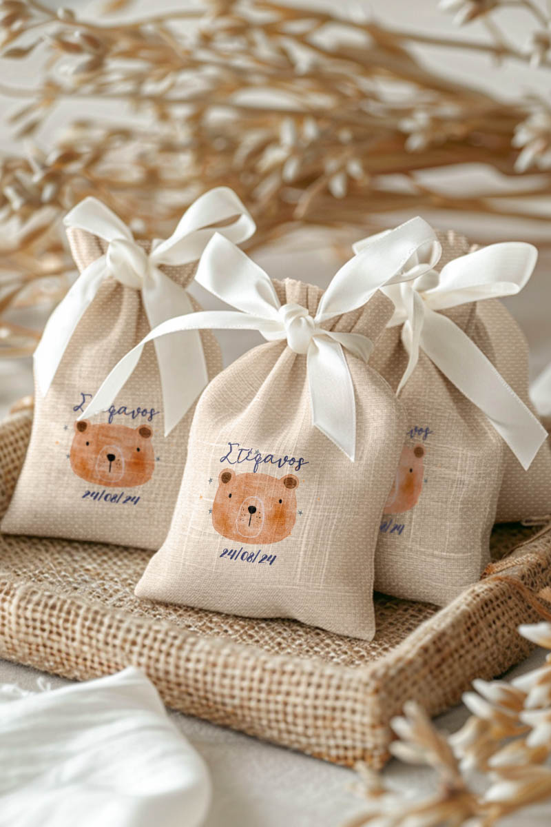 Μοντέρνες και Πρωτότυπες Μπομπονιέρες Βάπτισης με Πουγκί από Καμβά | Σετ Πουγκί, Εσωτερικό Τούλι & Κορδέλα Σατέν | Premium ποιότητα