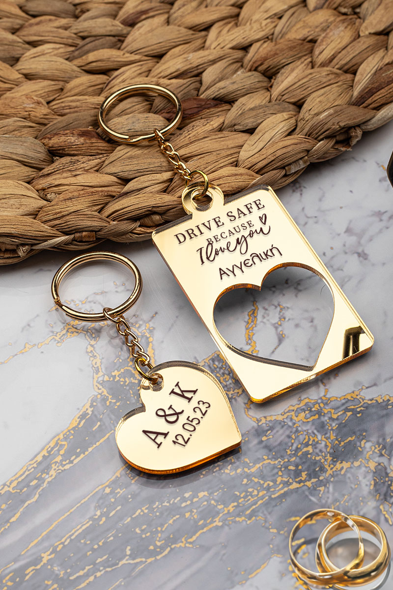 Σετ 2 προσωποποιημένων μπρελόκ, από χρυσό plexiglass καθρέπτη με μονογράμματα / φωτογραφία / ημερομηνία. Μοναδικό δώρο αγάπης για ζευγάρια!