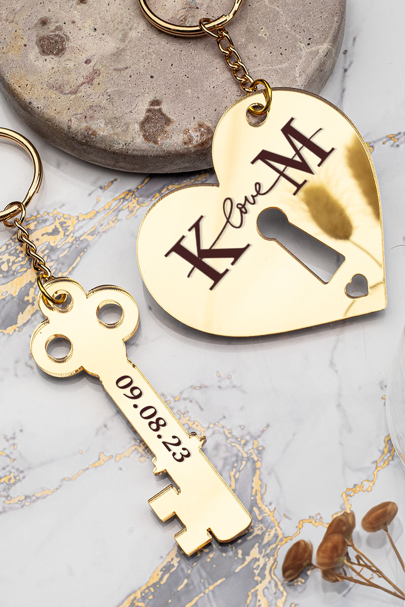 Σετ 2 προσωποποιημένων μπρελόκ, από χρυσό plexiglass καθρέπτη με μονογράμματα / φωτογραφία / ημερομηνία. Μοναδικό δώρο αγάπης για ζευγάρια!