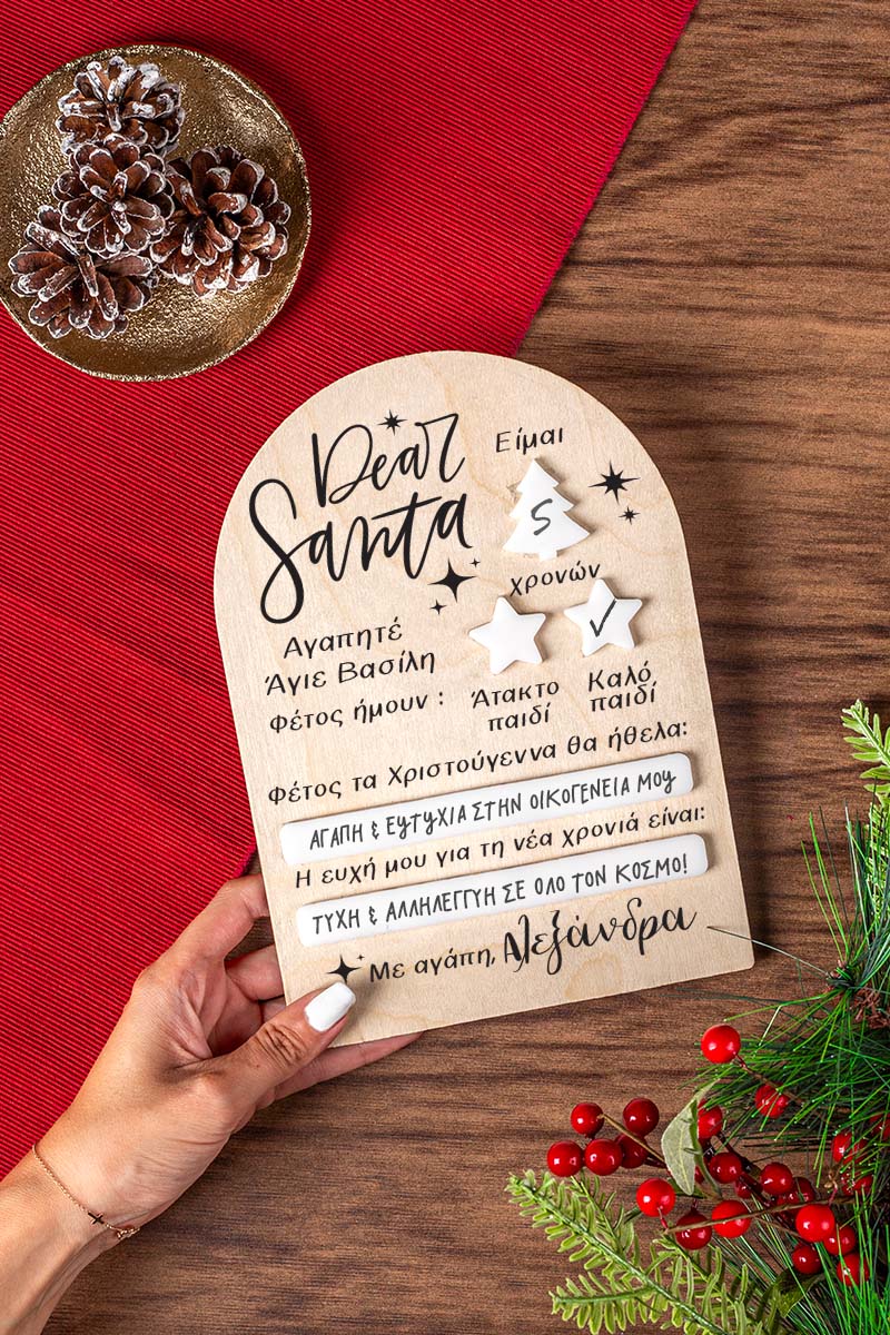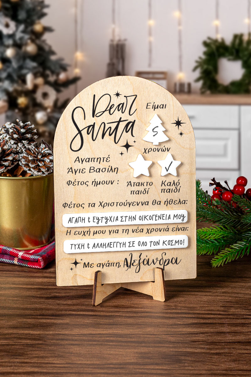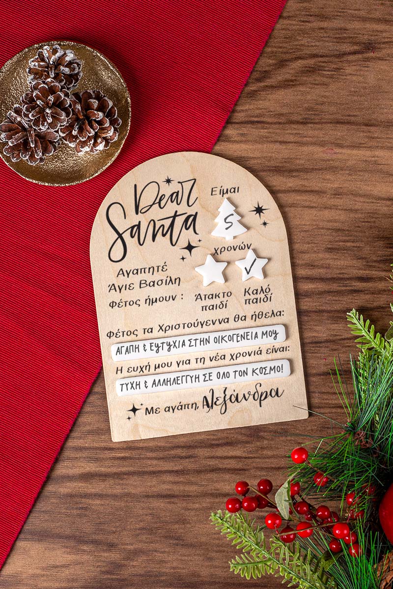 Προσωποποιημένη πλακέτα Αγίου Βασίλη. Γράψτε τις πληροφορίες όπως ηλικία, ευχές με μαρκαδοράκι που σβήνει ώστε να μπορεί να χρησιμοποιηθεί και την επόμενη χρονιά.