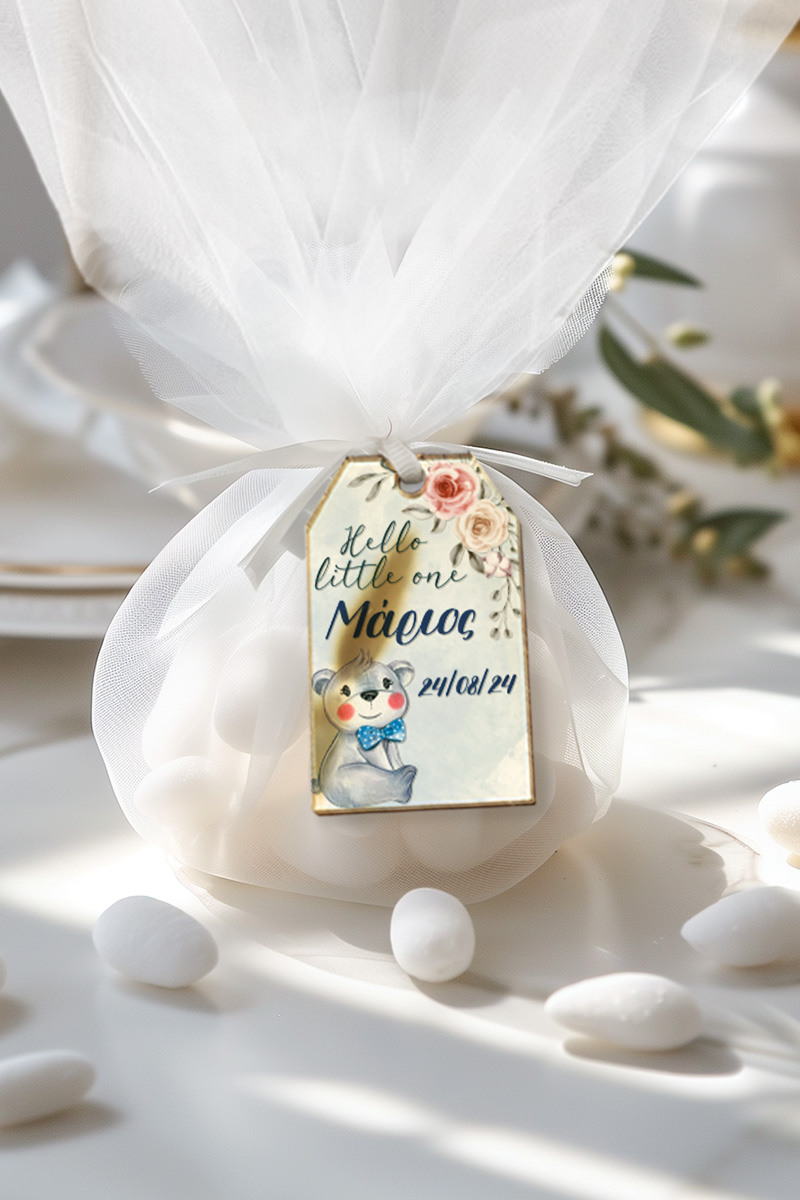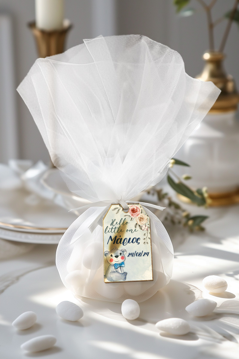 0.59€ – 1.49€Μοντέρνες & πρωτότυπες μπομπονιέρες βάπτισης με τούλι & κρεμαστό σχέδιο | Σετ εξωτερικό τούλι, Εσωτερικό τούλι, Κορδέλα σατέν & Κρεμαστό σχέδιο σε premium χαρτί, ξύλο ή plexiglass | Premium ποιότητα