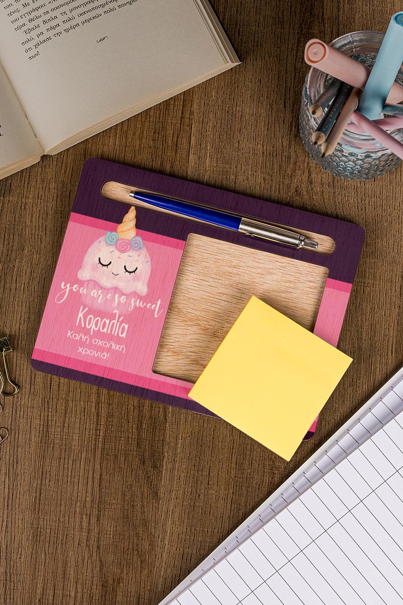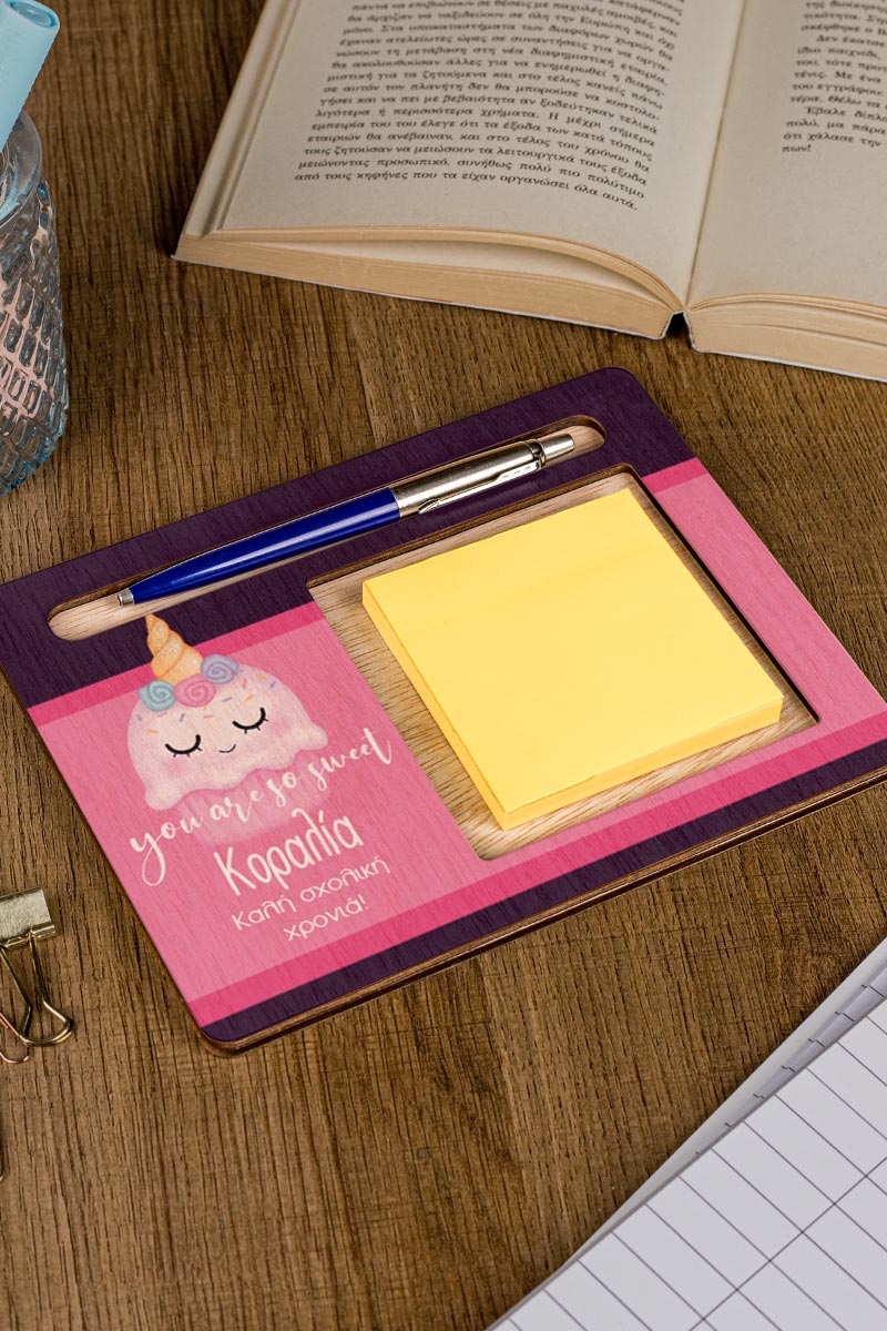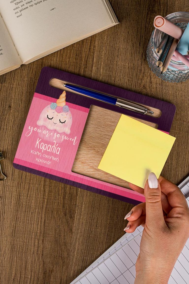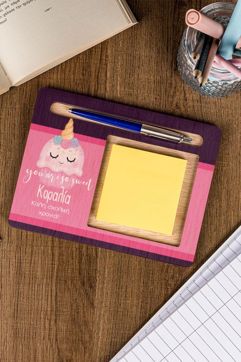 Διαμορφώστε το παιδικό γραφείο με στυλ και οργάνωση με τις προσωποποιημένες βάσεις οργάνωσης για χαρτάκια post it και στυλό. Αυτά τα προϊόντα δεν είναι μόνο πρακτικά, αλλά αποτελούν και μια όμορφη προσθήκη στην αισθητική του χώρου σας. Επιλέξτε το αγαπημένο σας σχέδιο και προσωποποιήστε το για μια πραγματικά μοναδική εμπειρία οργάνωσης.