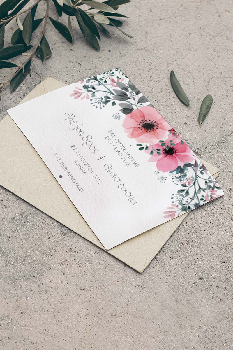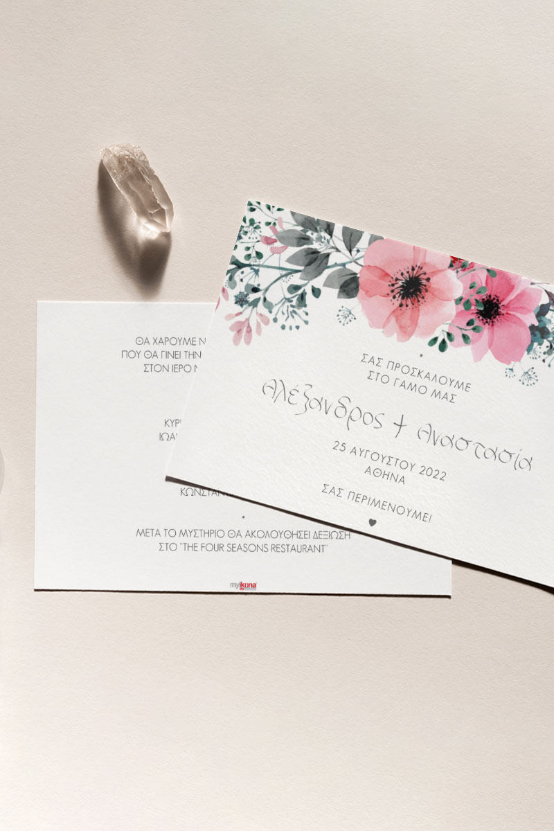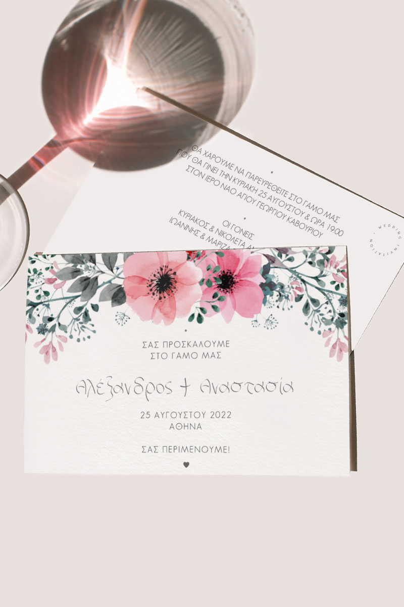 Αποκτήστε τα προσκλητήρια γάμου με σχέδιο Καλοκαιρινά Ροζ Άνθη. Οι πελάτες μας τα ξεχωρίζουν για το υψηλής ποιότητας ιταλικό χαρτί και την εκτύπωση υψηλής ευκρίνειας Myikona High Definition. Διαθέσιμα σε διαφορετικές διαστάσεις.
