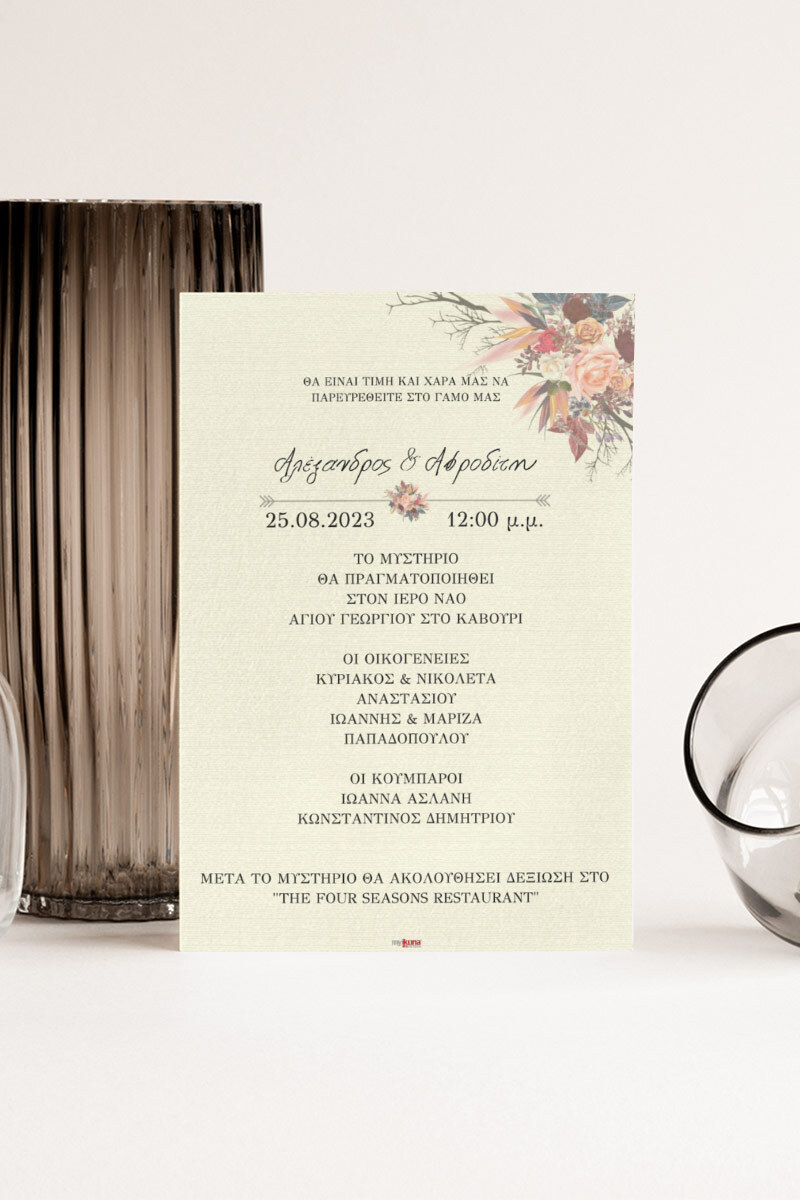 Αποκτήστε τα προσκλητήρια γάμου με σχέδιο Boho Κόκκινα Λουλούδια. Οι πελάτες μας τα ξεχωρίζουν για το υψηλής ποιότητας ιταλικό χαρτί και την εκτύπωση υψηλής ευκρίνειας Myikona High Definition. Διαθέσιμα σε διαφορετικές διαστάσεις.