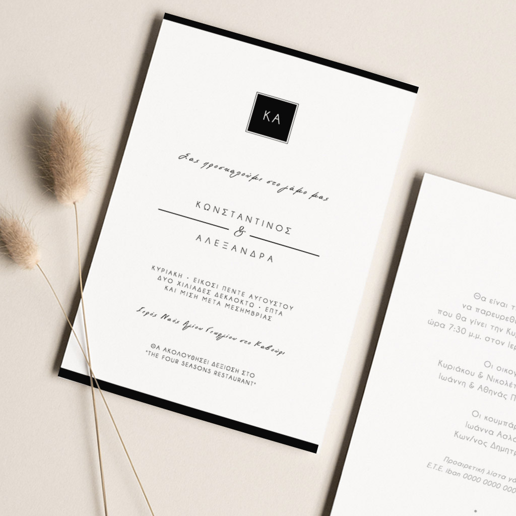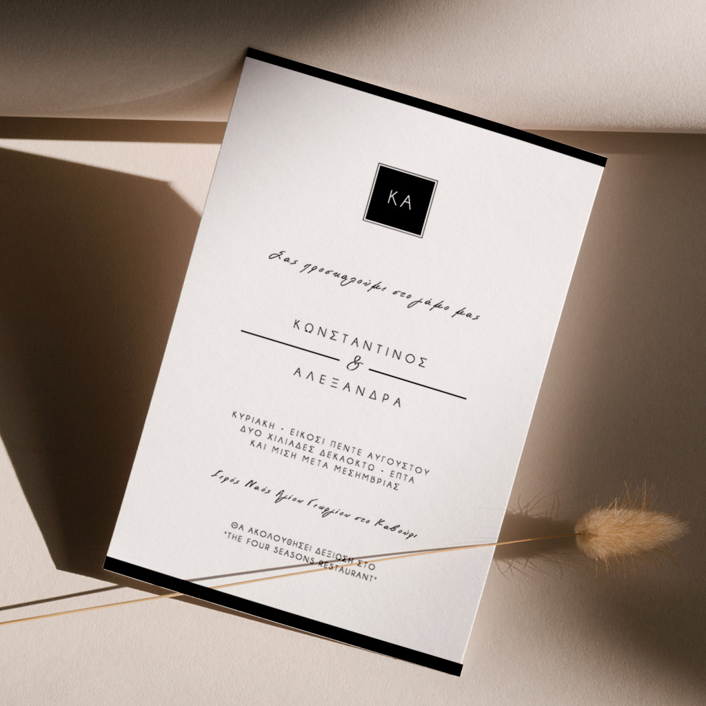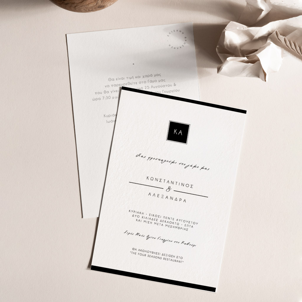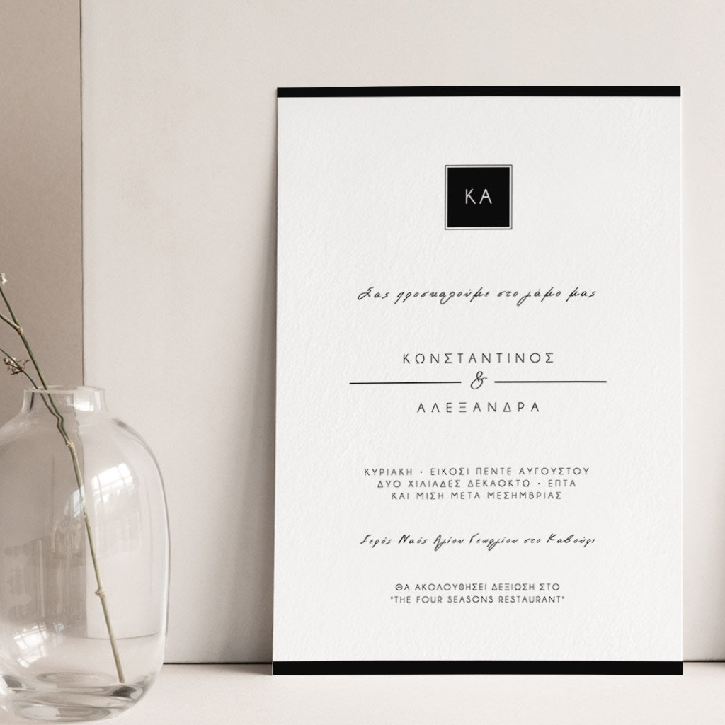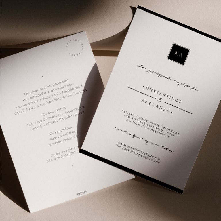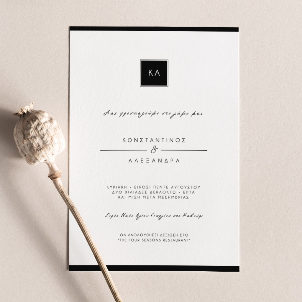 Αποκτήστε τα προσκλητήρια γάμου με σχέδιο Minimal Elegance. Οι πελάτες μας τα ξεχωρίζουν για το υψηλής ποιότητας ιταλικό χαρτί και την εκτύπωση υψηλής ευκρίνειας Myikona High Definition. Διαθέσιμα σε διαφορετικές διαστάσεις.