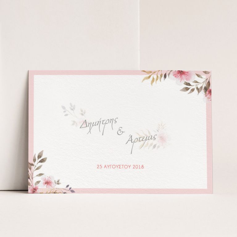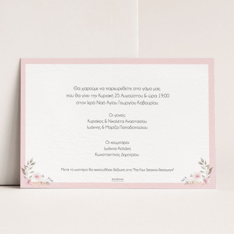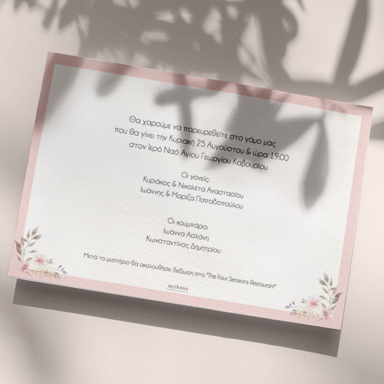 Αποκτήστε τα προσκλητήρια γάμου με σχέδιο Καλοκαιρινά Ροζ Άνθη. Οι πελάτες μας τα ξεχωρίζουν για το υψηλής ποιότητας ιταλικό χαρτί και την εκτύπωση υψηλής ευκρίνειας Myikona High Definition. Διαθέσιμα σε διαφορετικές διαστάσεις.