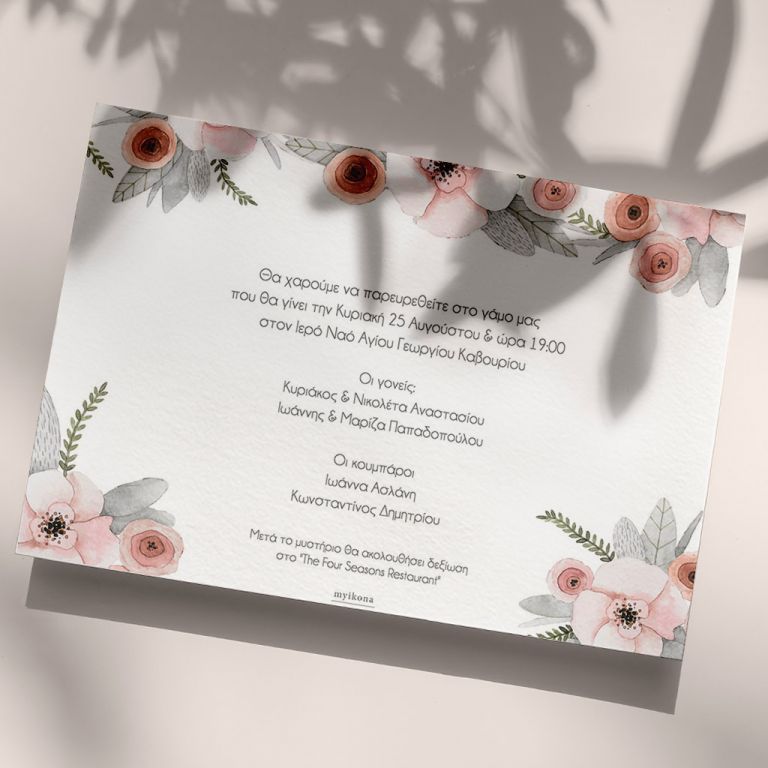 Αποκτήστε τα προσκλητήρια γάμου με σχέδιο Καλοκαιρινά Ροζ Άνθη. Οι πελάτες μας τα ξεχωρίζουν για το υψηλής ποιότητας ιταλικό χαρτί και την εκτύπωση υψηλής ευκρίνειας Myikona High Definition. Διαθέσιμα σε διαφορετικές διαστάσεις.
