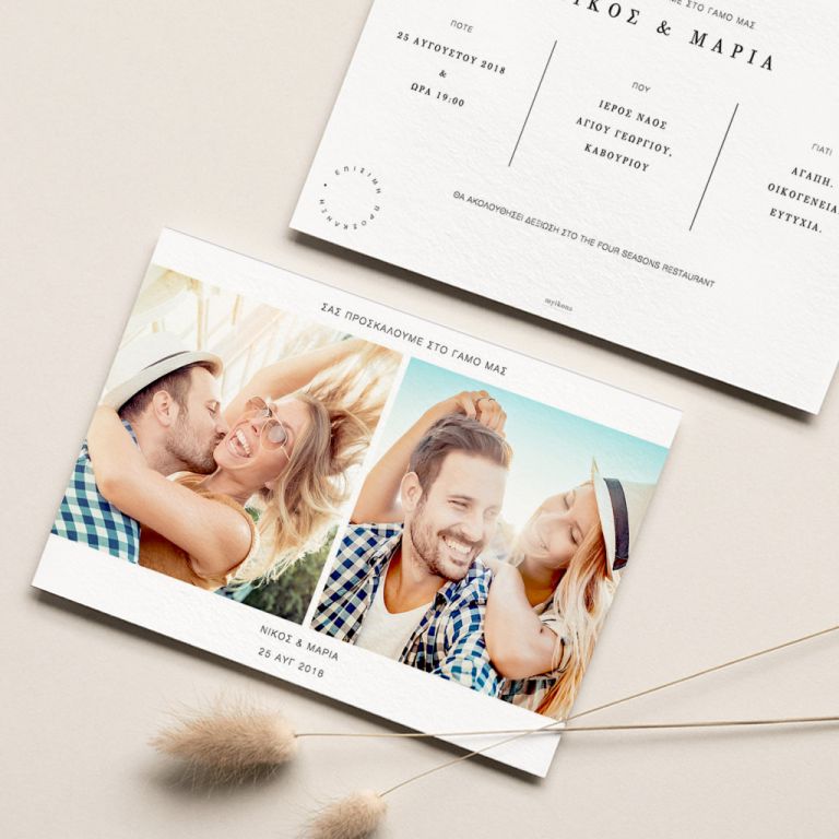 Αποκτήστε τα προσκλητήρια γάμου με σχέδιο Minimal Elegance. Οι πελάτες μας τα ξεχωρίζουν για το υψηλής ποιότητας ιταλικό χαρτί και την εκτύπωση υψηλής ευκρίνειας Myikona High Definition. Διαθέσιμα σε διαφορετικές διαστάσεις.