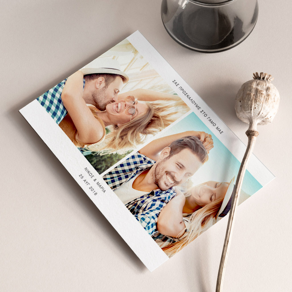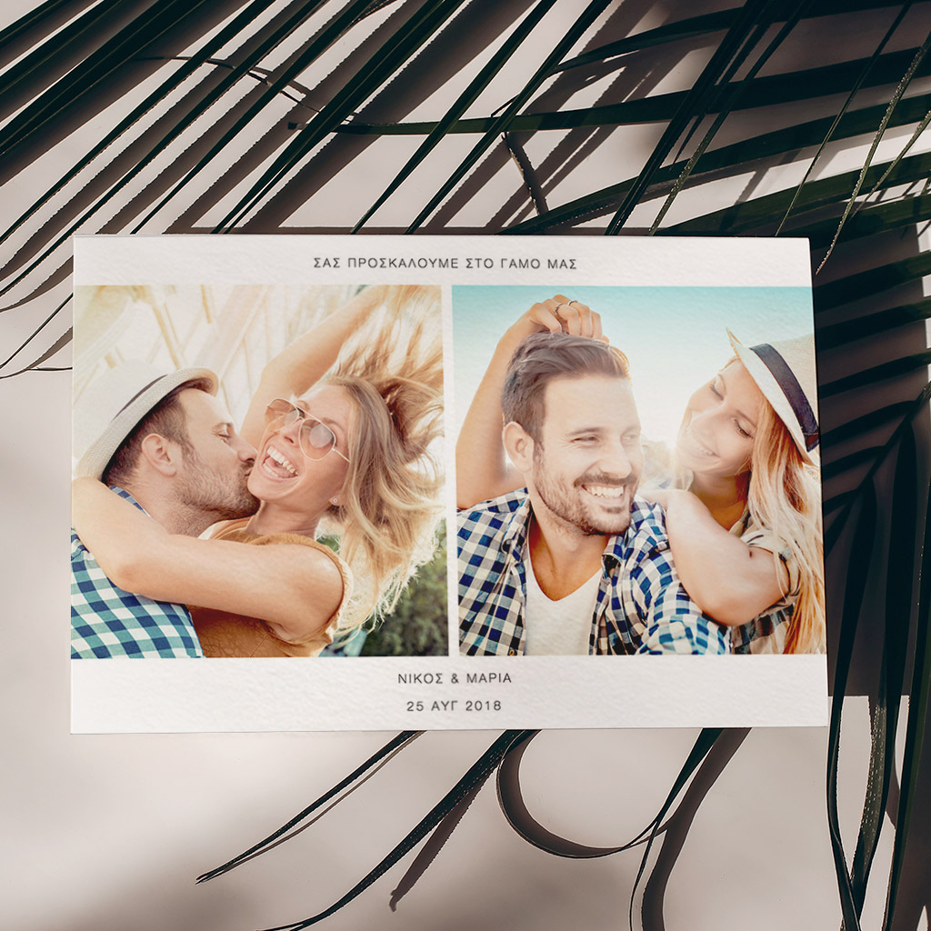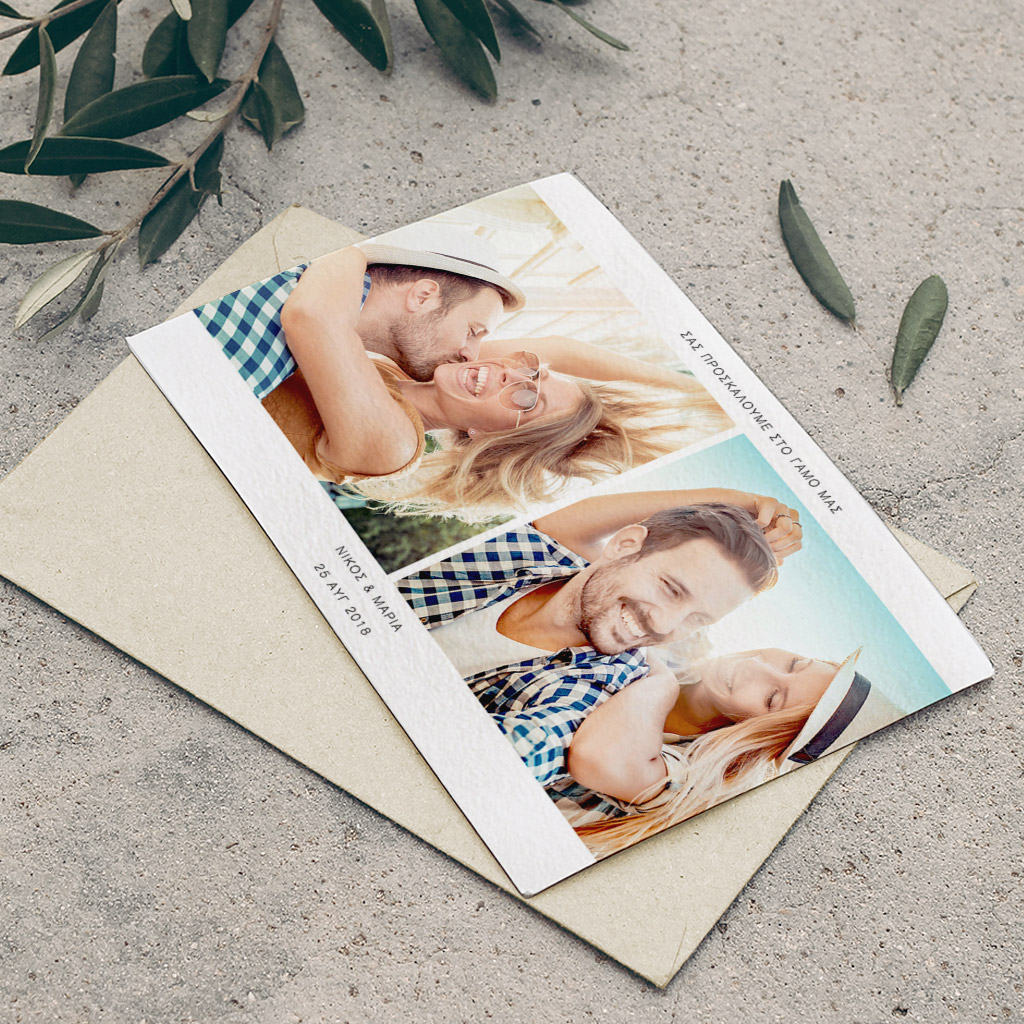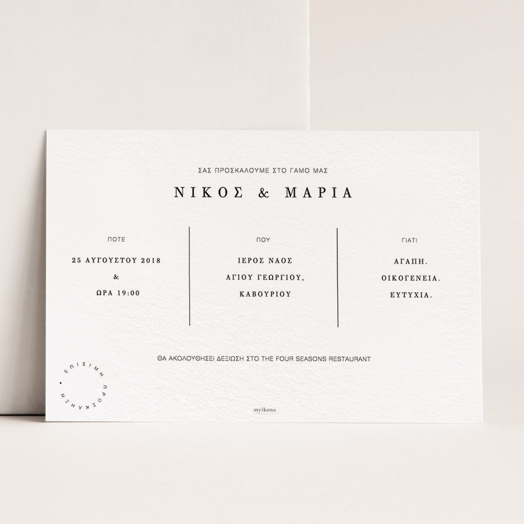 Αποκτήστε τα προσκλητήρια γάμου με σχέδιο Minimal Elegance. Οι πελάτες μας τα ξεχωρίζουν για το υψηλής ποιότητας ιταλικό χαρτί και την εκτύπωση υψηλής ευκρίνειας Myikona High Definition. Διαθέσιμα σε διαφορετικές διαστάσεις.