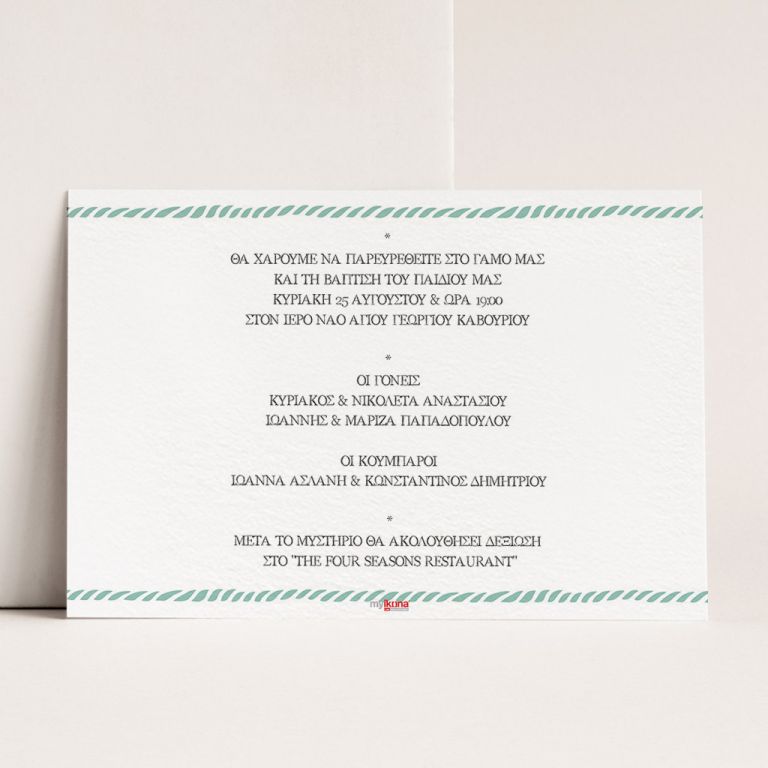 Αποκτήστε τα προσκλητήρια γάμου με σχέδιο Minimal Elegance. Οι πελάτες μας τα ξεχωρίζουν για το υψηλής ποιότητας ιταλικό χαρτί και την εκτύπωση υψηλής ευκρίνειας Myikona High Definition. Διαθέσιμα σε διαφορετικές διαστάσεις.