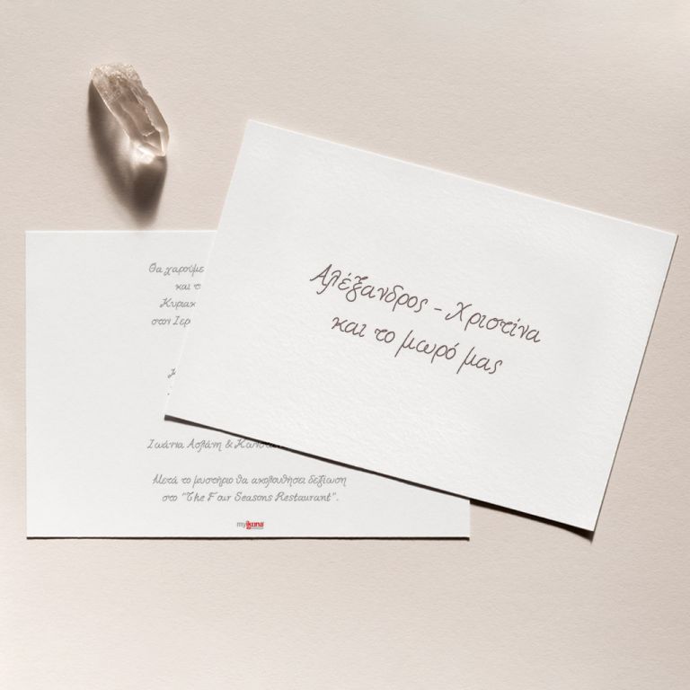 Αποκτήστε τα προσκλητήρια γάμου με σχέδιο Minimal Elegance. Οι πελάτες μας τα ξεχωρίζουν για το υψηλής ποιότητας ιταλικό χαρτί και την εκτύπωση υψηλής ευκρίνειας Myikona High Definition. Διαθέσιμα σε διαφορετικές διαστάσεις.