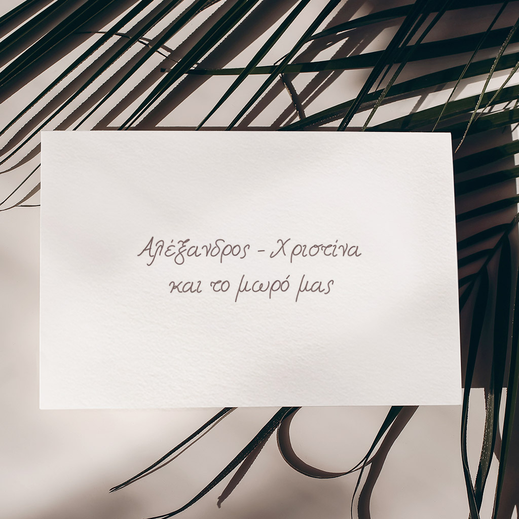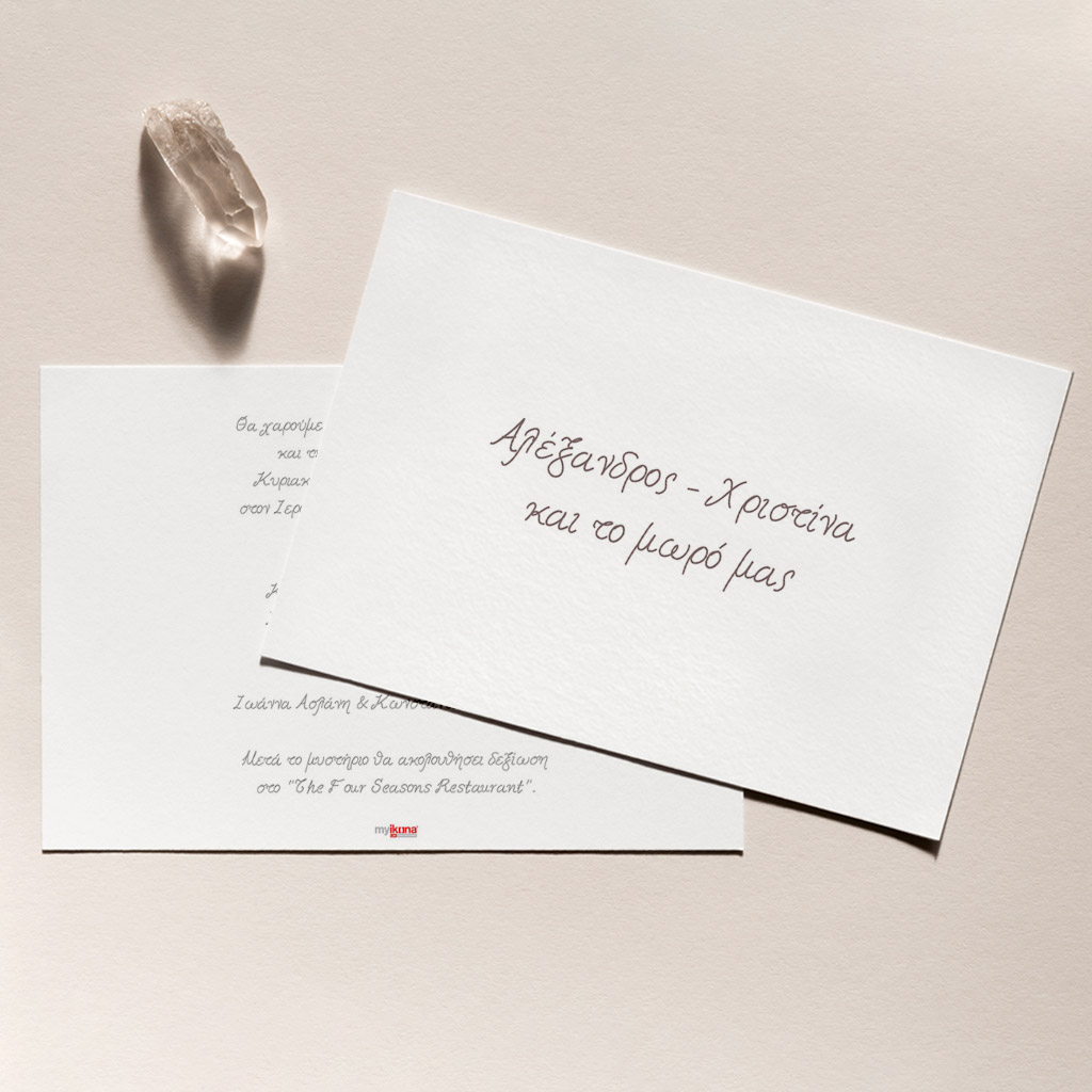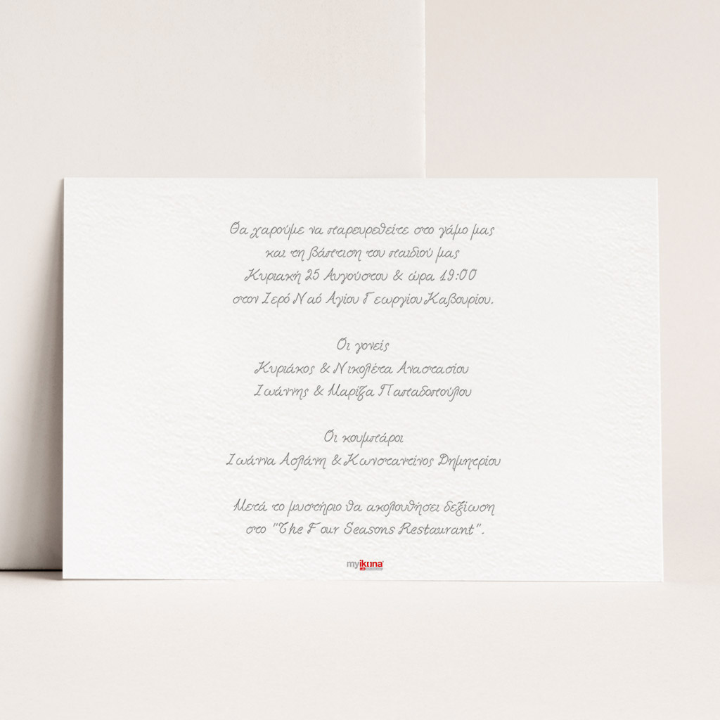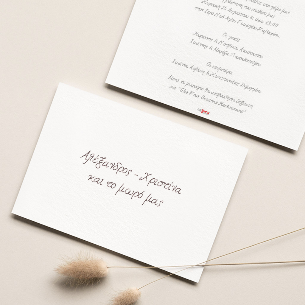 Αποκτήστε τα προσκλητήρια γάμου με σχέδιο Minimal Elegance. Οι πελάτες μας τα ξεχωρίζουν για το υψηλής ποιότητας ιταλικό χαρτί και την εκτύπωση υψηλής ευκρίνειας Myikona High Definition. Διαθέσιμα σε διαφορετικές διαστάσεις.
