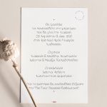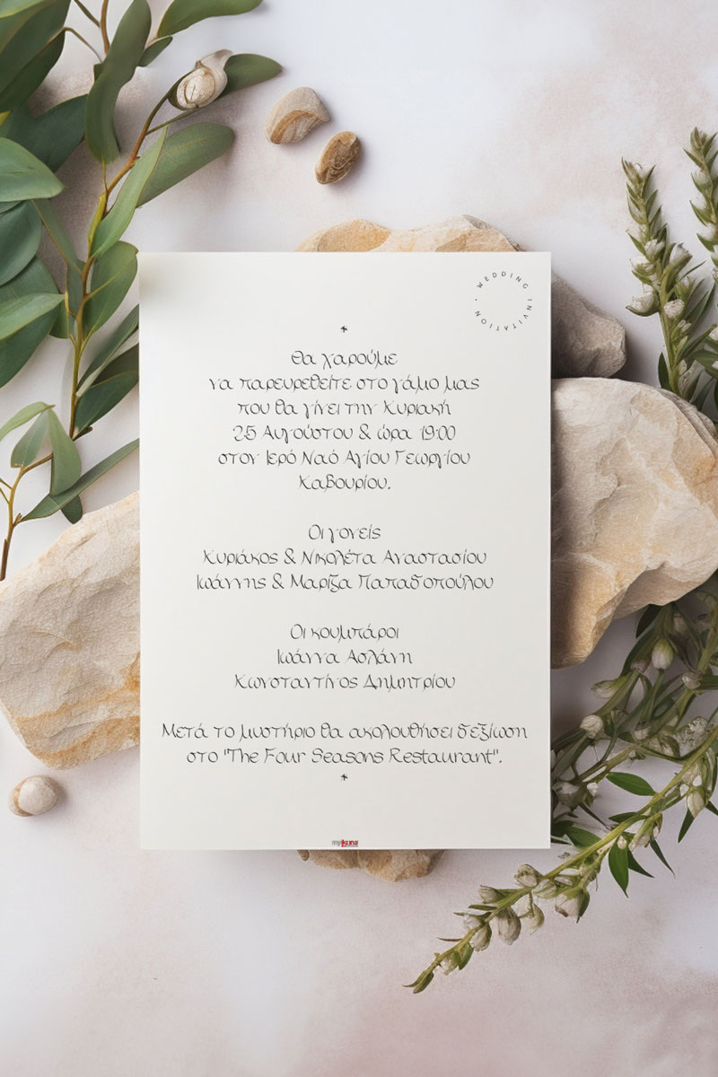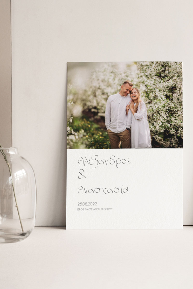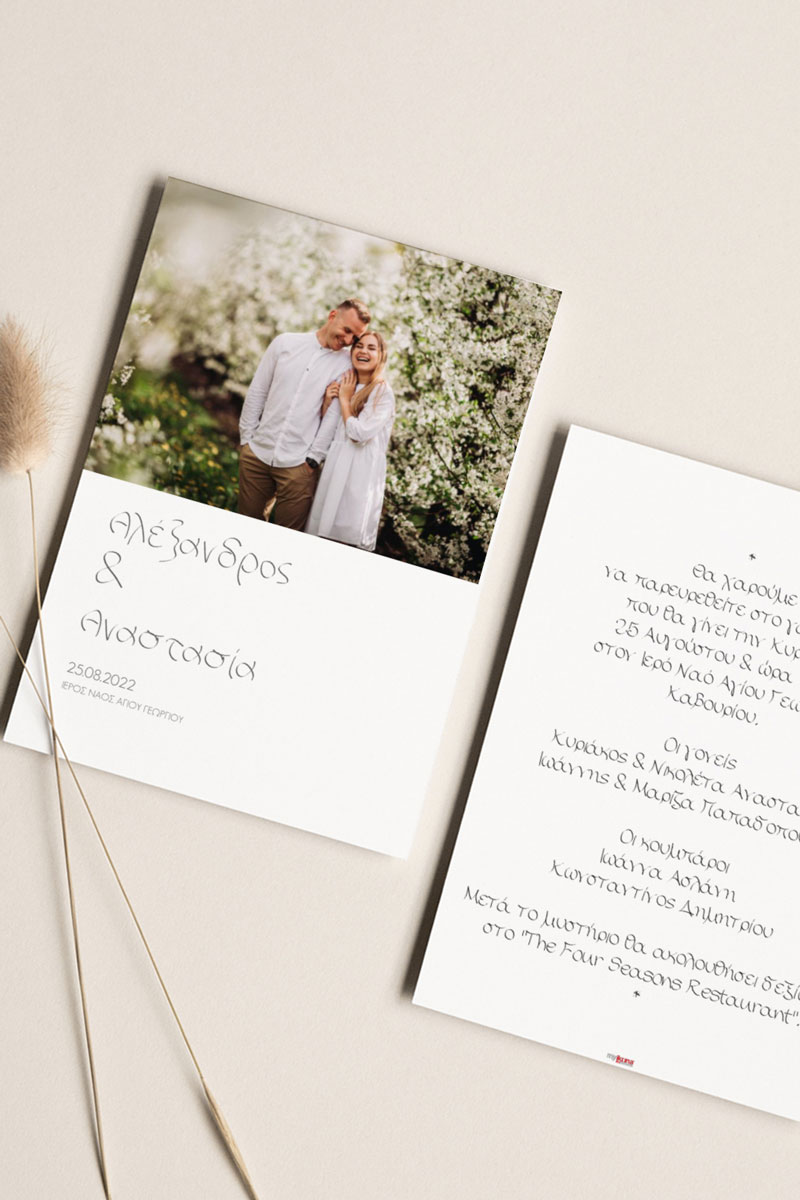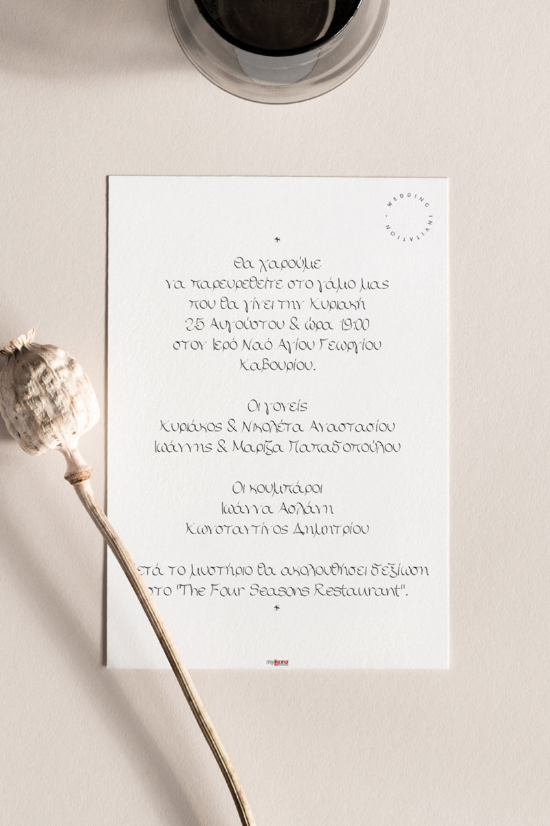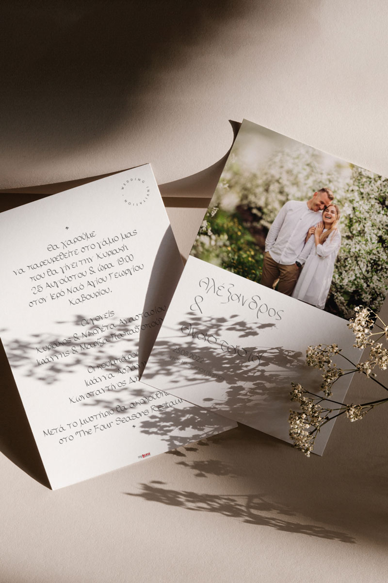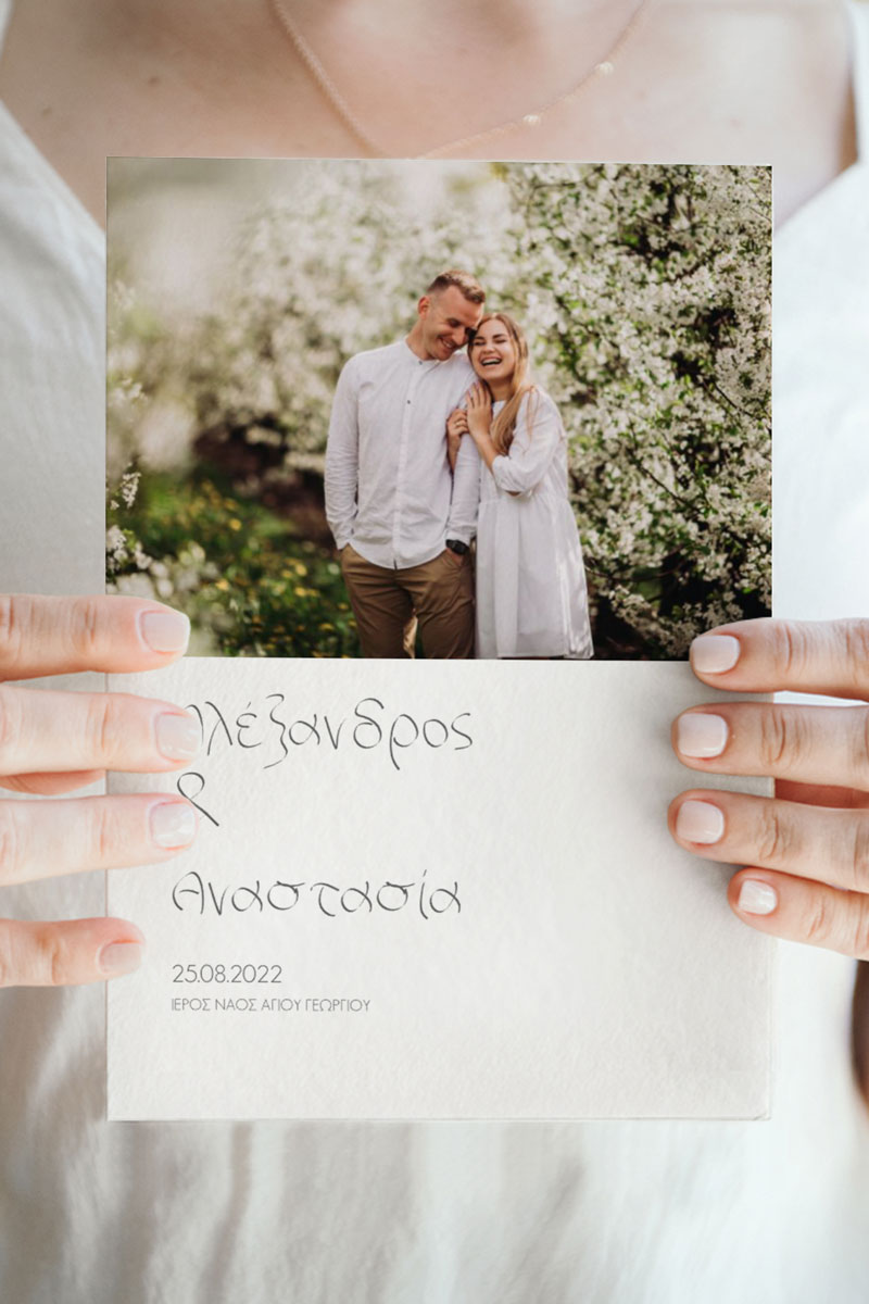 Αποκτήστε τα προσκλητήρια γάμου με σχέδιο Minimal Elegance. Οι πελάτες μας τα ξεχωρίζουν για το υψηλής ποιότητας ιταλικό χαρτί και την εκτύπωση υψηλής ευκρίνειας Myikona High Definition. Διαθέσιμα σε διαφορετικές διαστάσεις.