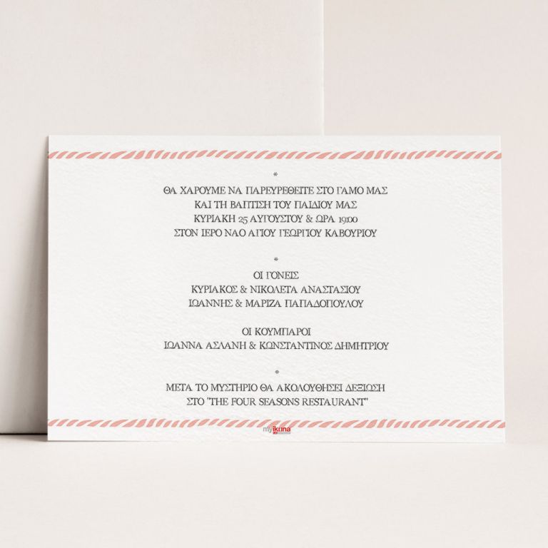 Αποκτήστε τα προσκλητήρια γάμου με σχέδιο Minimal Elegance. Οι πελάτες μας τα ξεχωρίζουν για το υψηλής ποιότητας ιταλικό χαρτί και την εκτύπωση υψηλής ευκρίνειας Myikona High Definition. Διαθέσιμα σε διαφορετικές διαστάσεις.