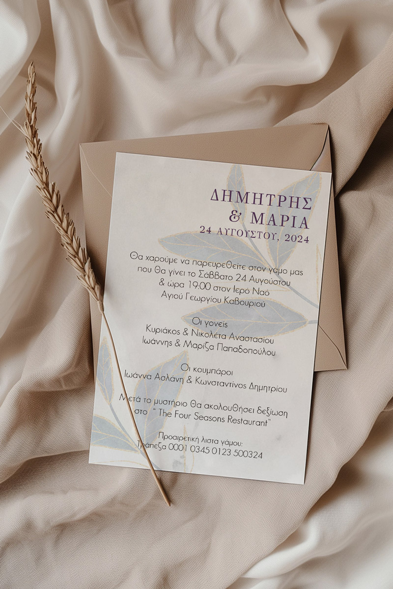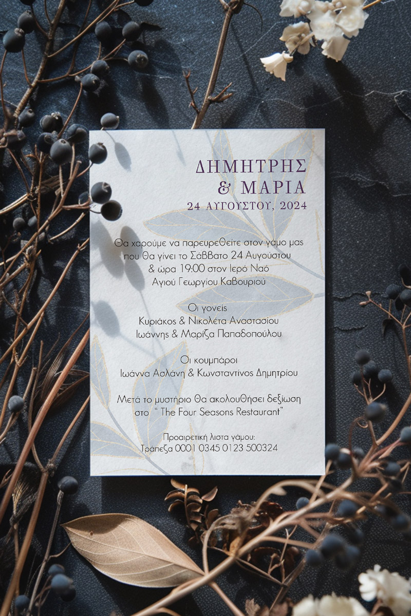 Αποκτήστε τα προσκλητήρια γάμου με σχέδιο Minimal Elegance. Οι πελάτες μας τα ξεχωρίζουν για το υψηλής ποιότητας ιταλικό χαρτί και την εκτύπωση υψηλής ευκρίνειας Myikona High Definition. Διαθέσιμα σε διαφορετικές διαστάσεις.
