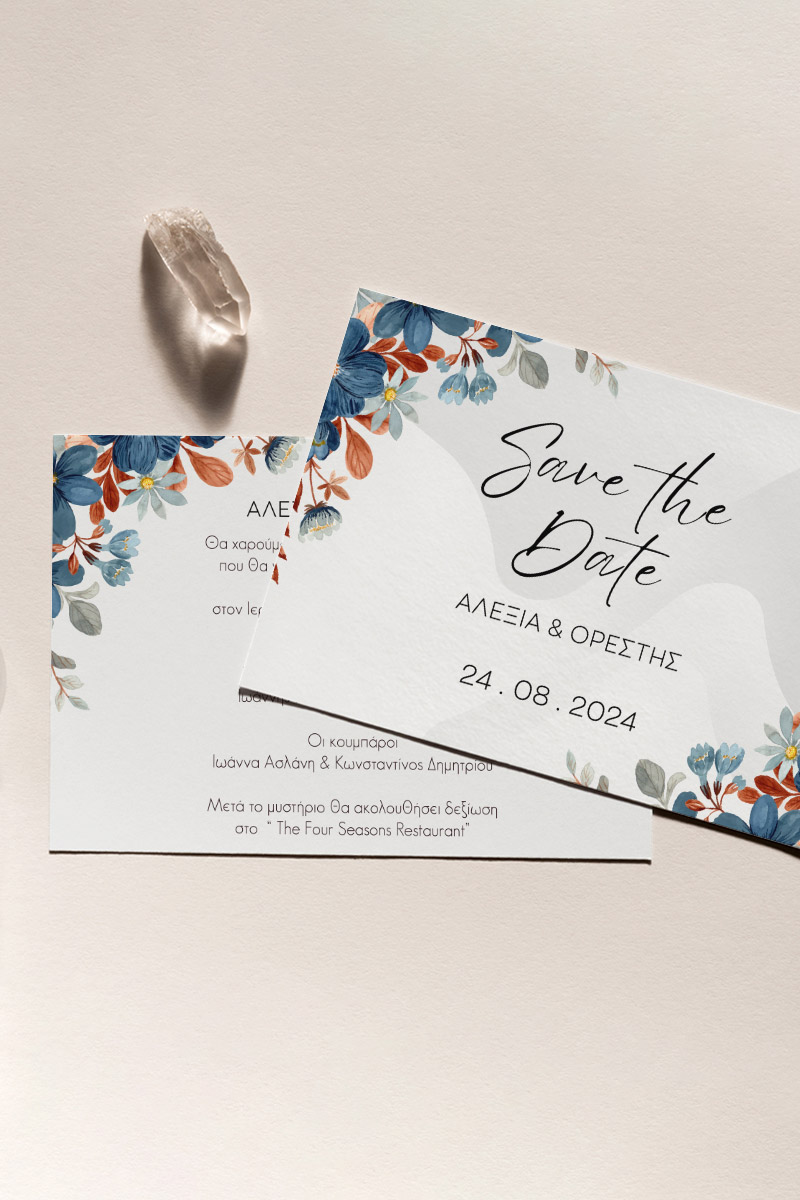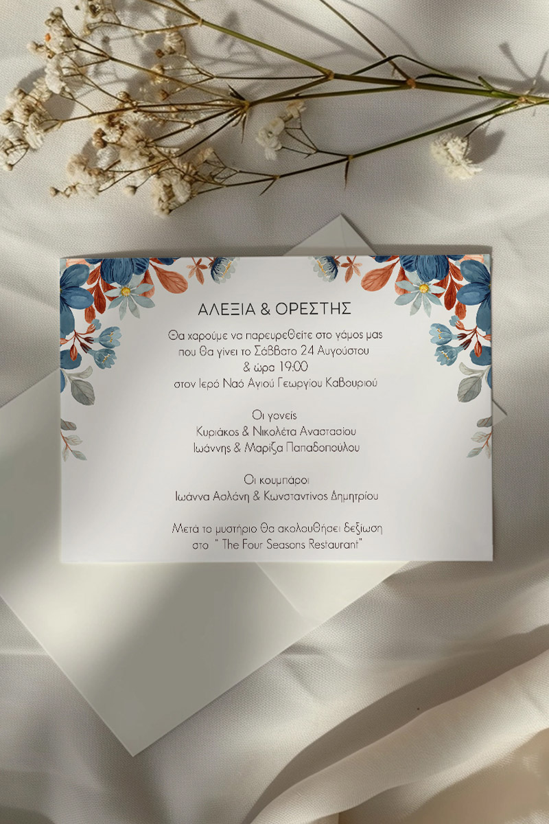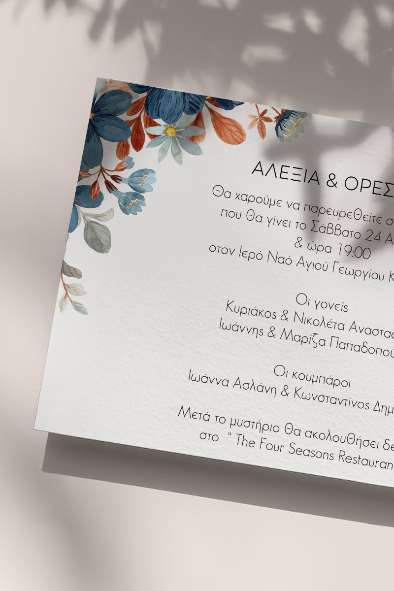 Αποκτήστε τα προσκλητήρια γάμου με σχέδιο Minimal Ανθισμένα Λουλούδια. Οι πελάτες μας τα ξεχωρίζουν για το υψηλής ποιότητας ιταλικό χαρτί και την εκτύπωση υψηλής ευκρίνειας Myikona High Definition. Διαθέσιμα σε διαφορετικές διαστάσεις.