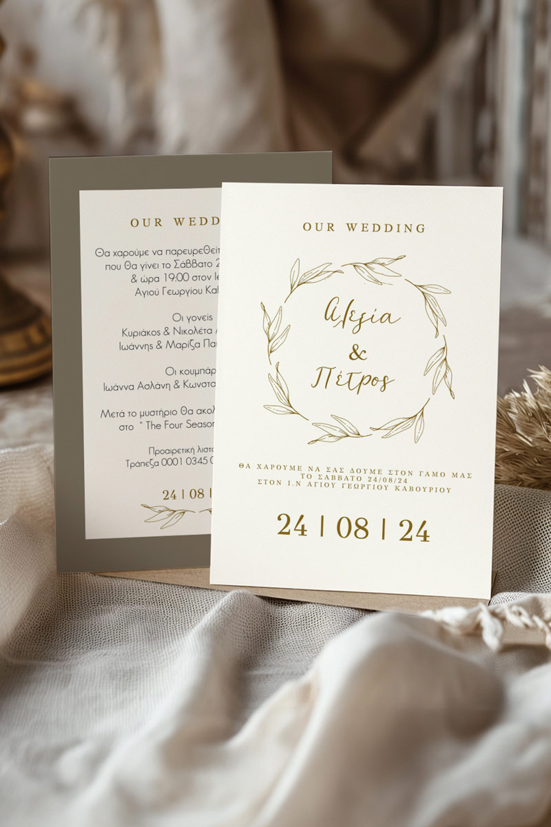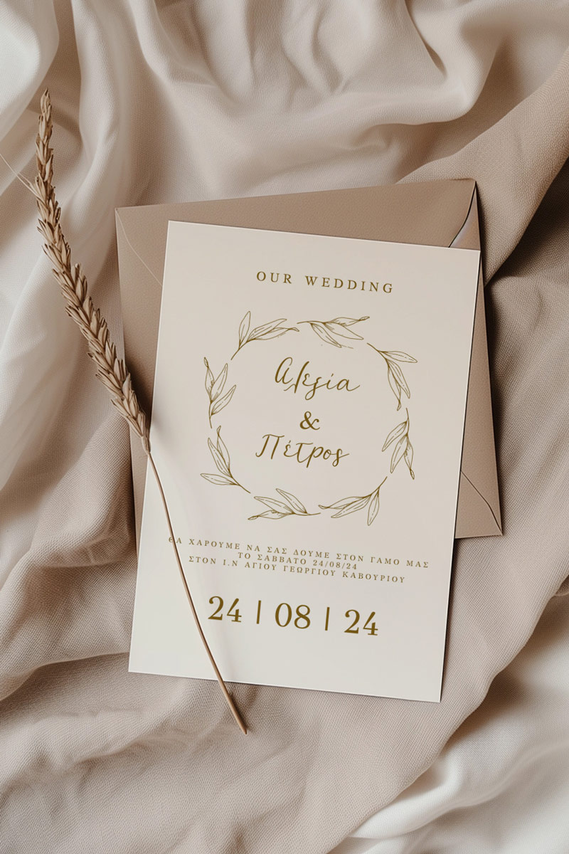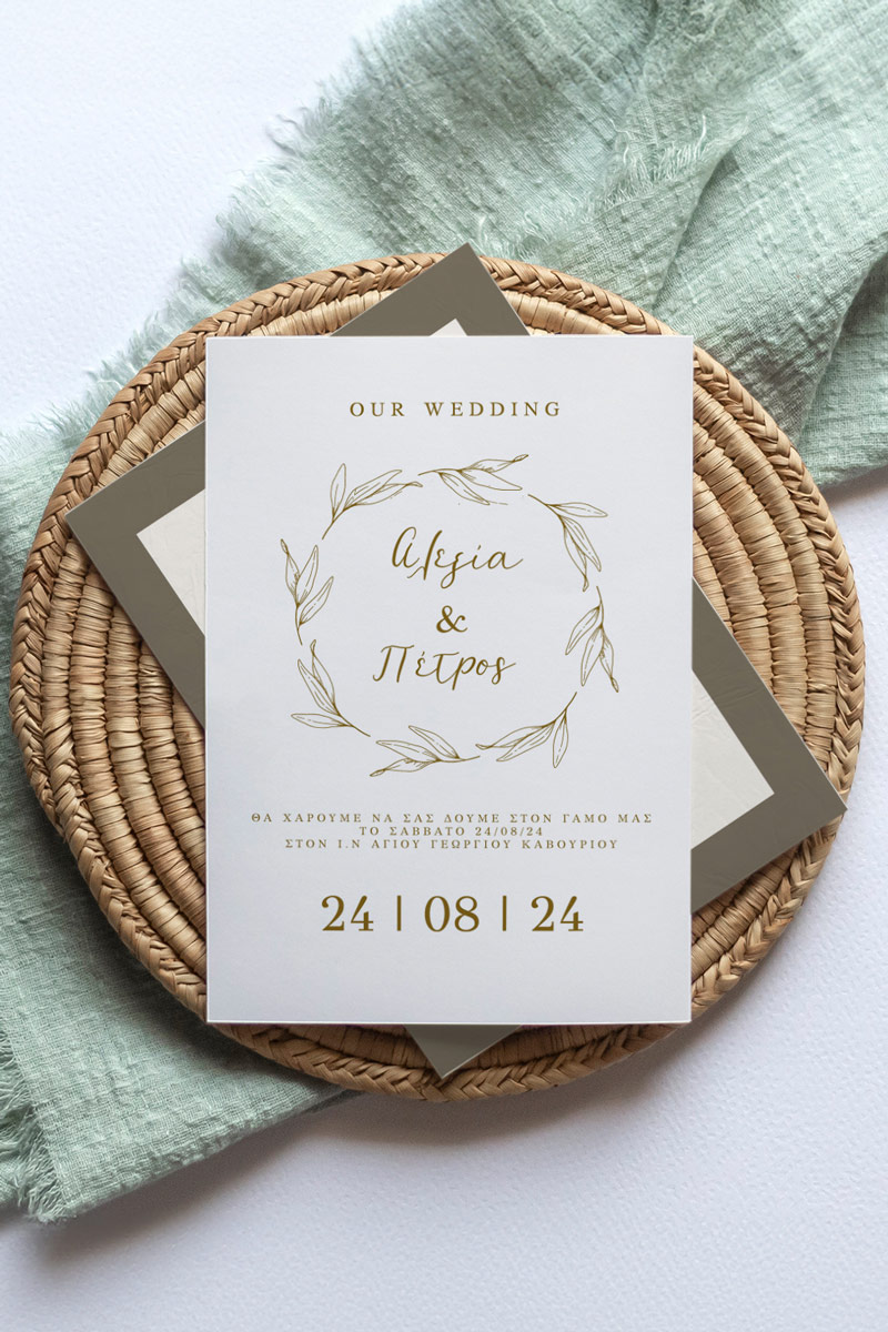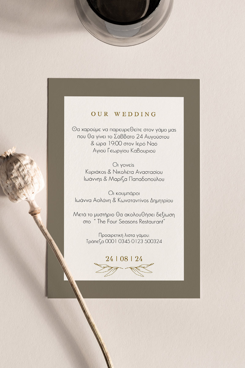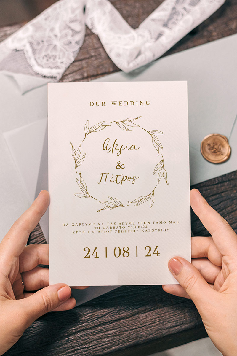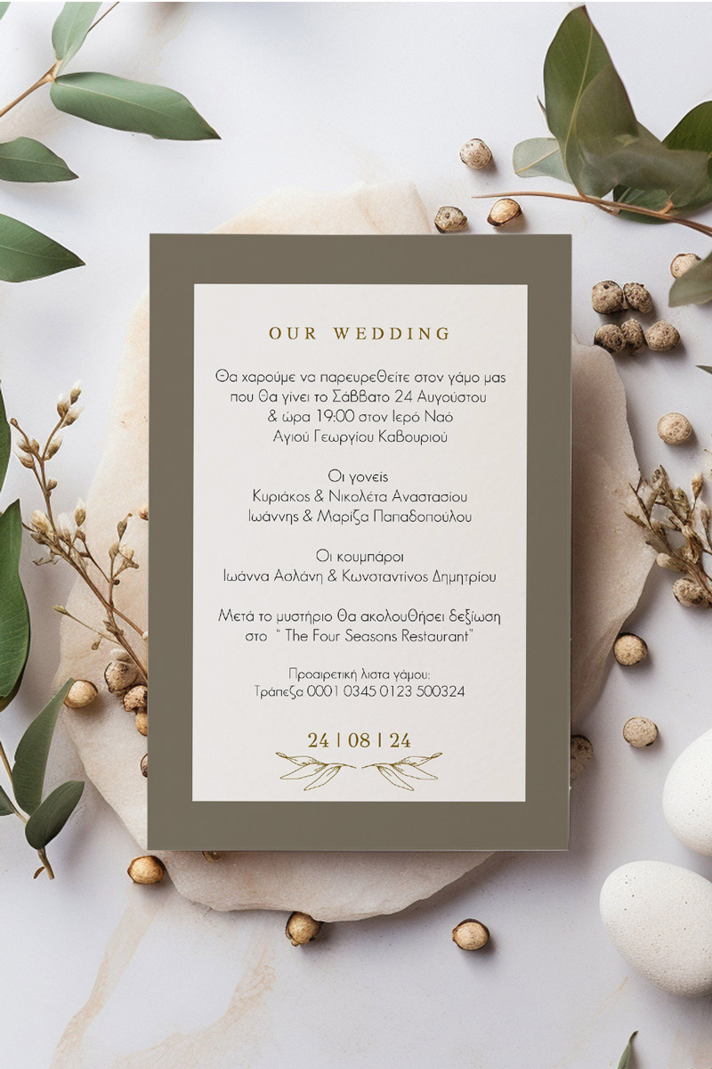Αποκτήστε τα προσκλητήρια γάμου με σχέδιο Minimal Elegance. Οι πελάτες μας τα ξεχωρίζουν για το υψηλής ποιότητας ιταλικό χαρτί και την εκτύπωση υψηλής ευκρίνειας Myikona High Definition. Διαθέσιμα σε διαφορετικές διαστάσεις.