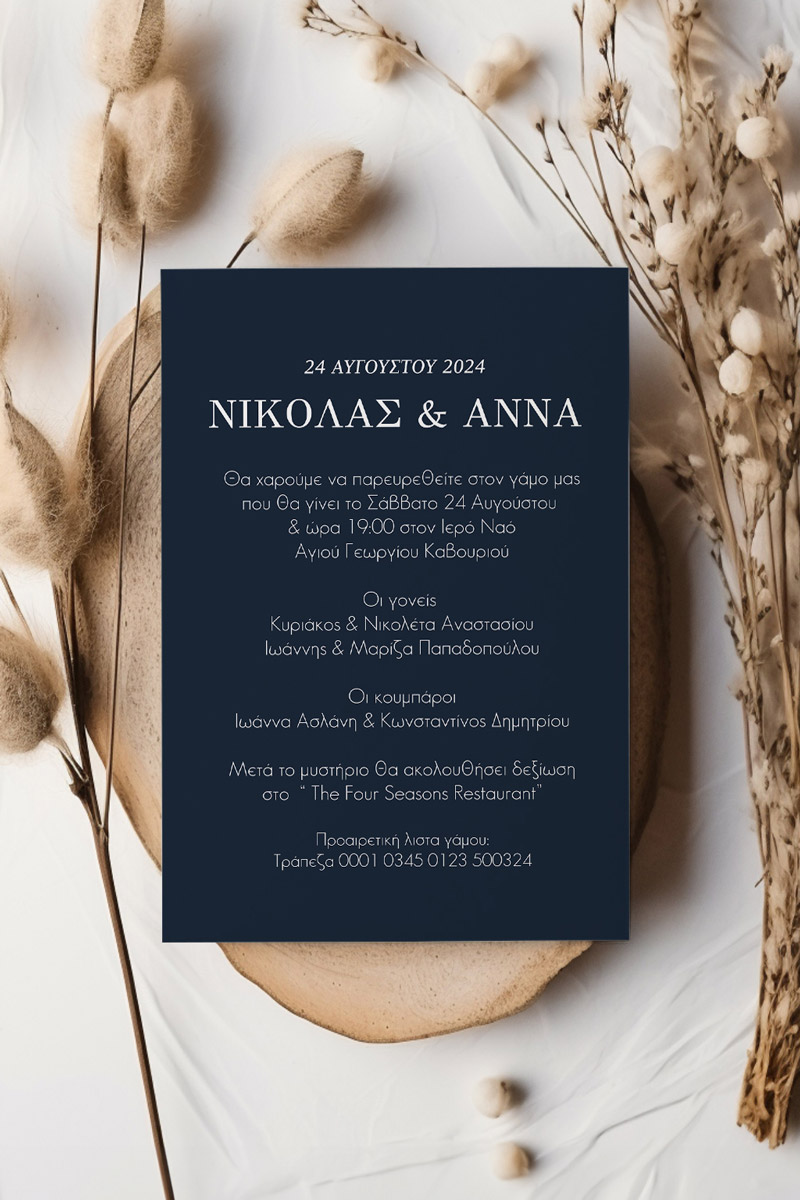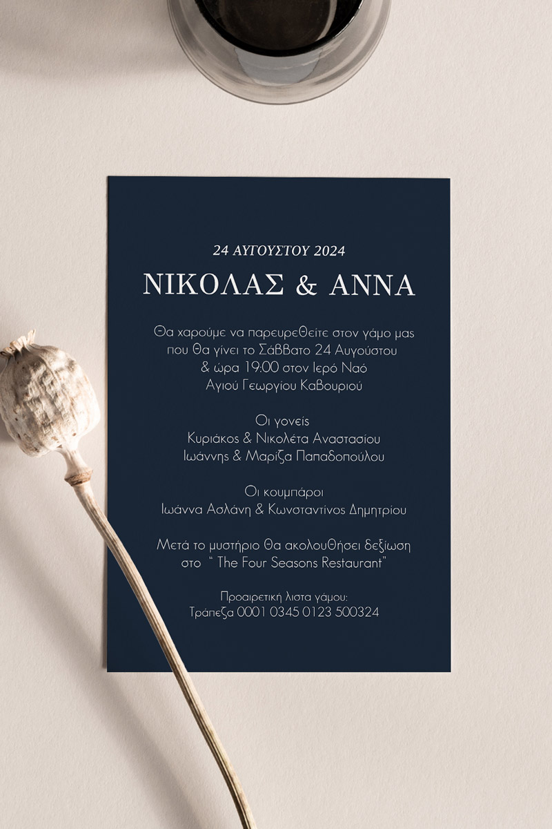 Αποκτήστε τα προσκλητήρια γάμου με σχέδιο Minimal Elegance. Οι πελάτες μας τα ξεχωρίζουν για το υψηλής ποιότητας ιταλικό χαρτί και την εκτύπωση υψηλής ευκρίνειας Myikona High Definition. Διαθέσιμα σε διαφορετικές διαστάσεις.