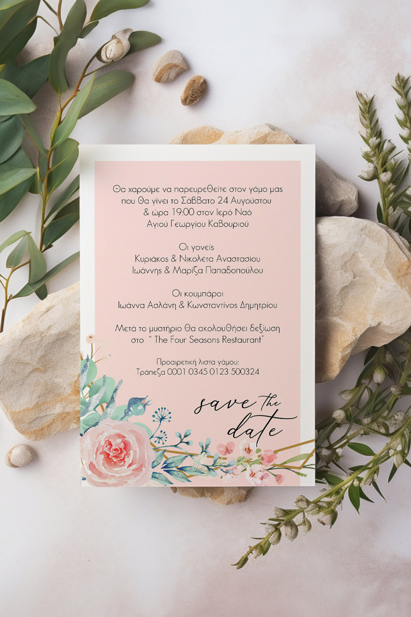 Αποκτήστε τα προσκλητήρια γάμου με σχέδιο Καλοκαιρινά Ροζ Άνθη. Οι πελάτες μας τα ξεχωρίζουν για το υψηλής ποιότητας ιταλικό χαρτί και την εκτύπωση υψηλής ευκρίνειας Myikona High Definition. Διαθέσιμα σε διαφορετικές διαστάσεις.